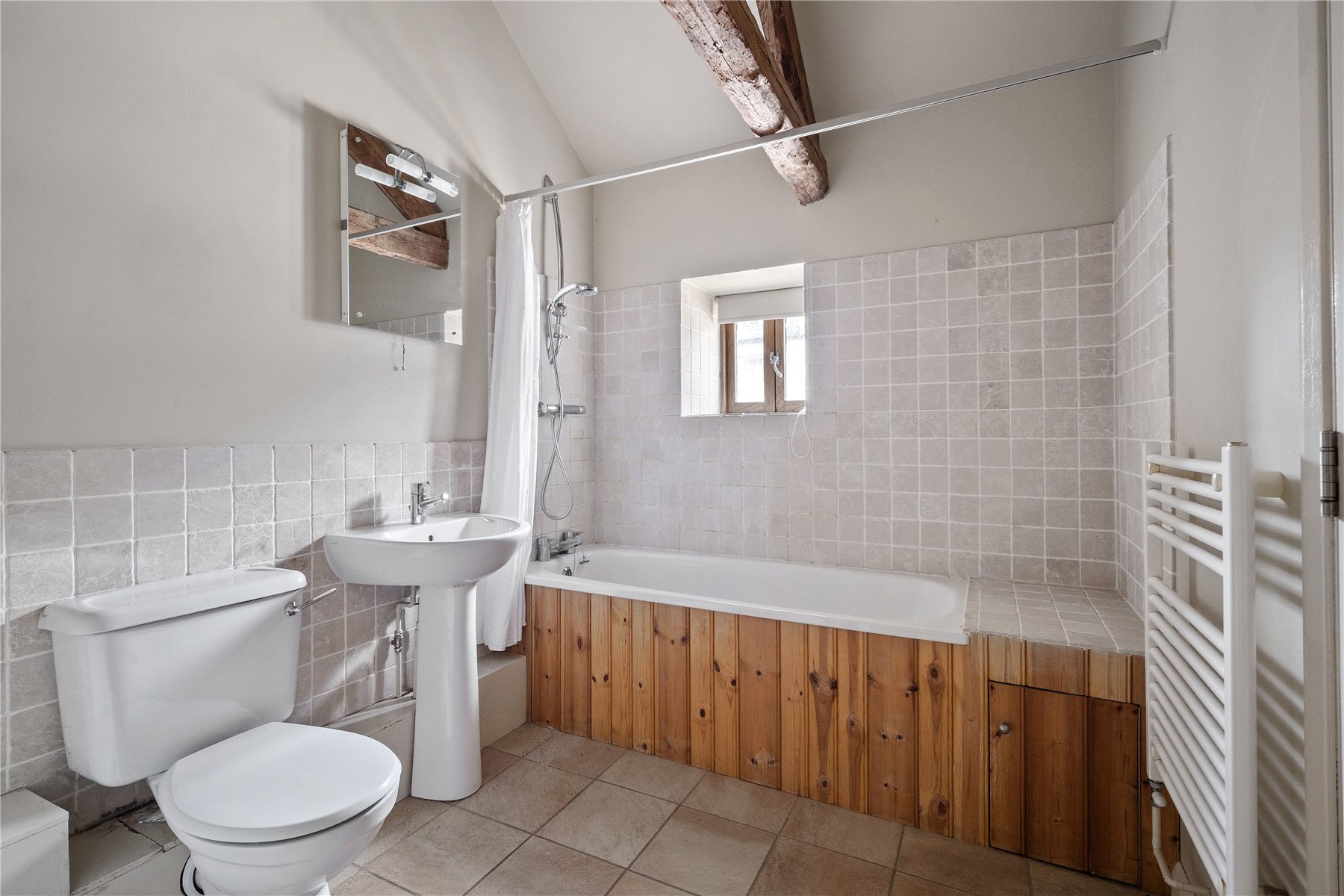 The BEDROOM readily accommodates a double bed and further furniture, and includes the same high vaulted ceilings evidenced elsewhere. The FAMILY BATHROOM includes a panelled bath with shower over, wash hand basin, and W.C.