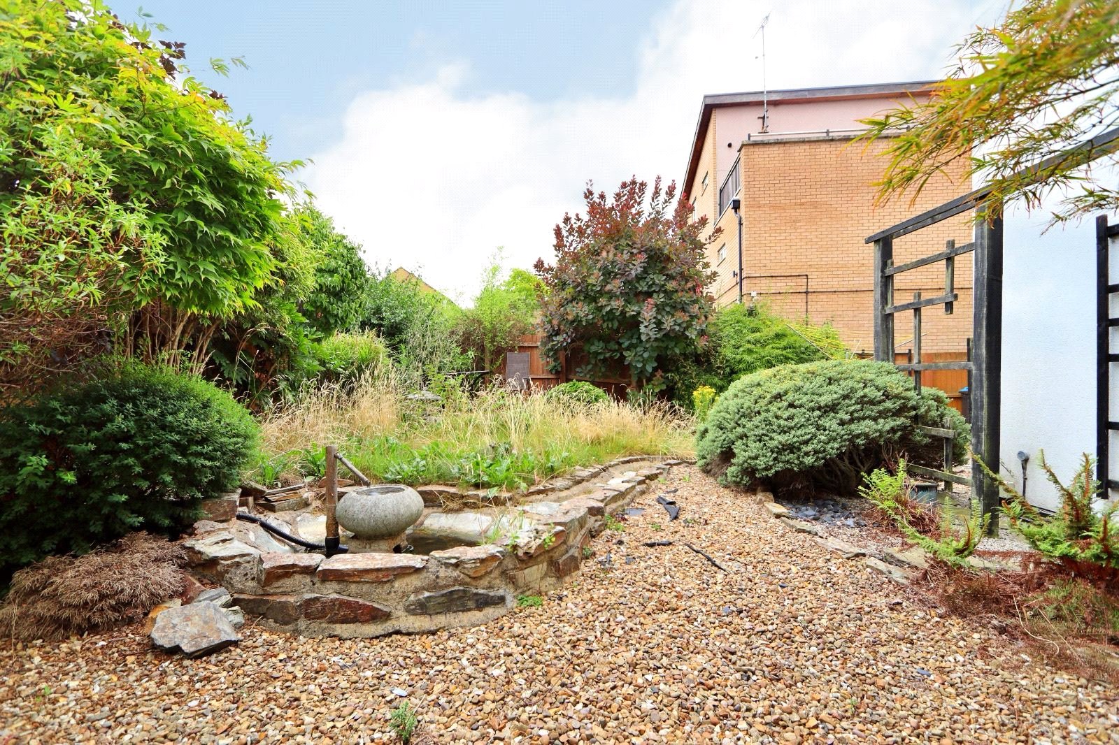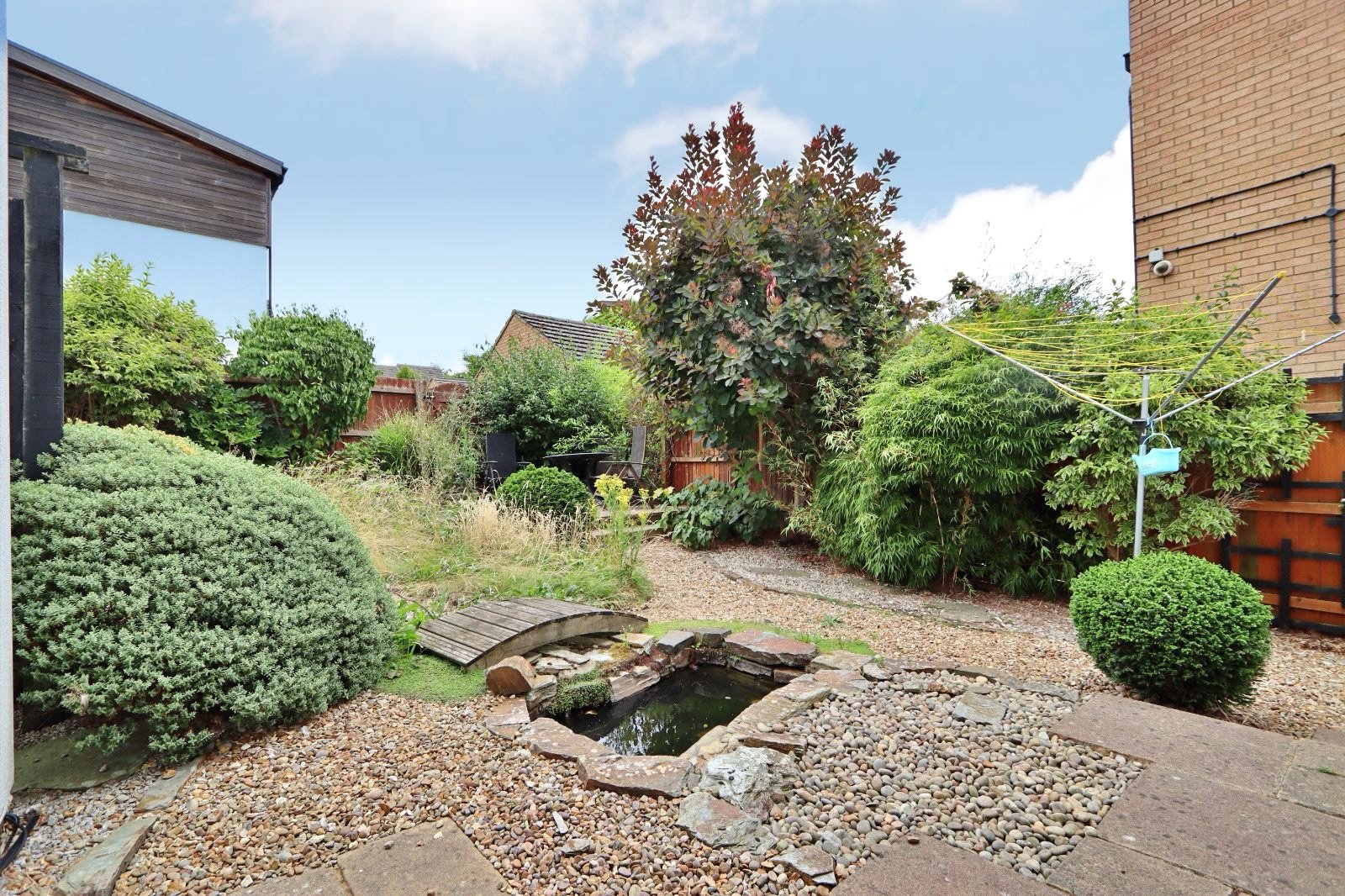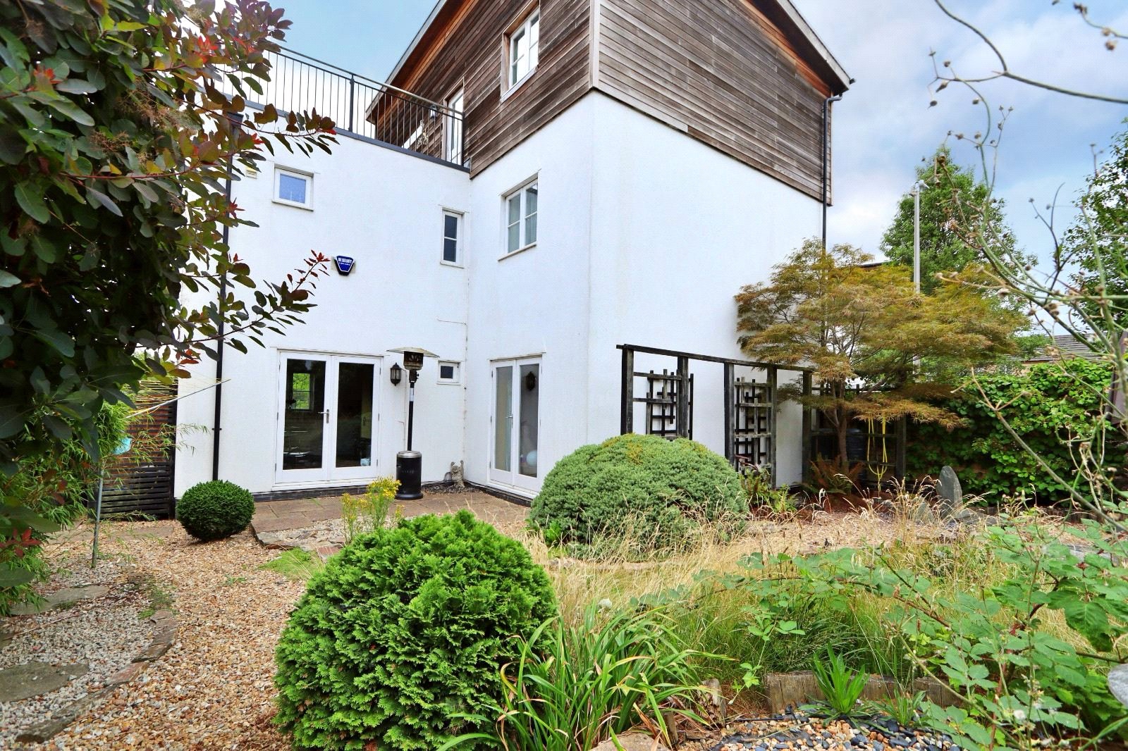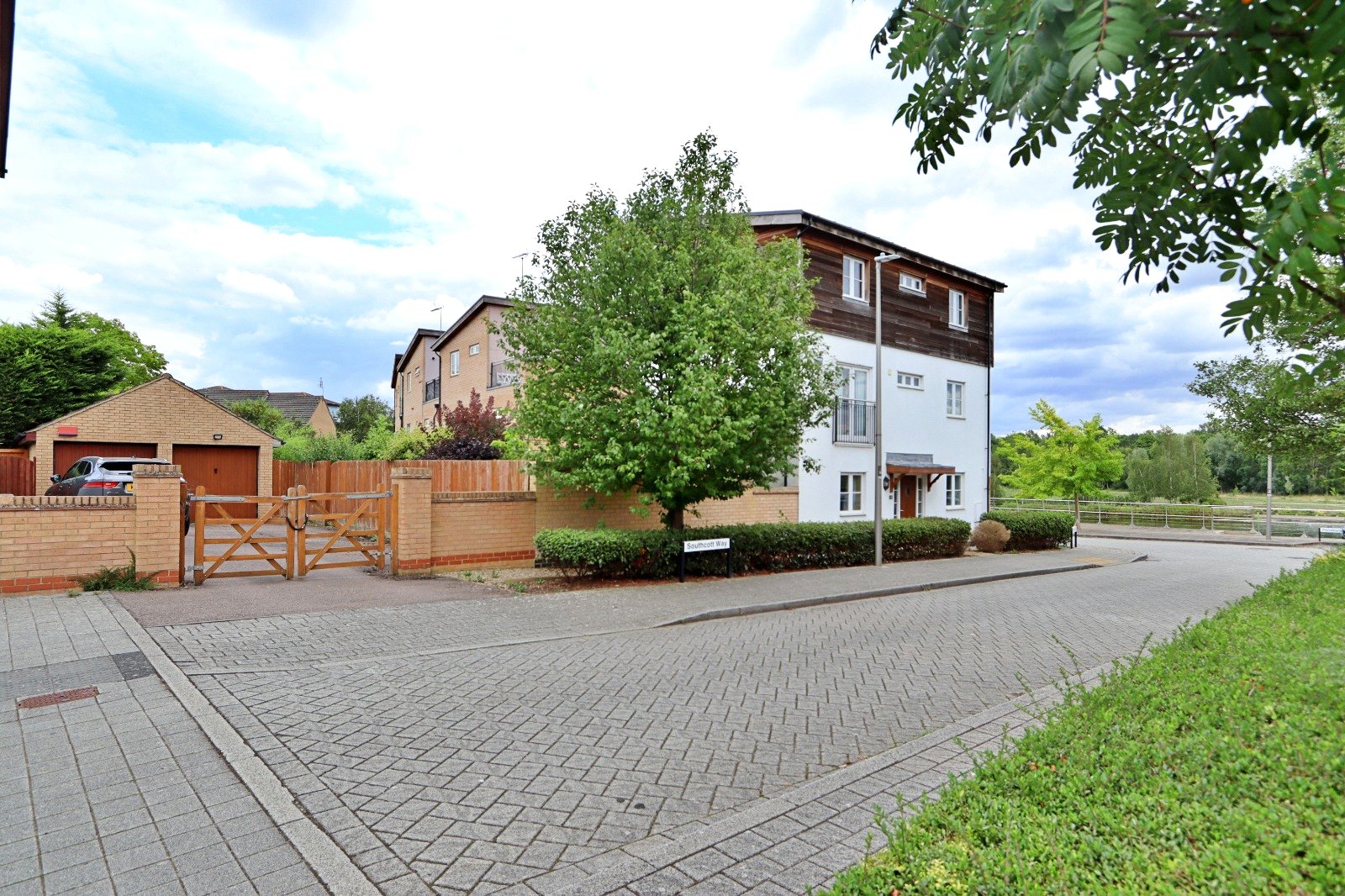 Externally the property boasts a private rear garden, primarily laid with patio - and a double length garage ahead of a driveway behind timber gates.