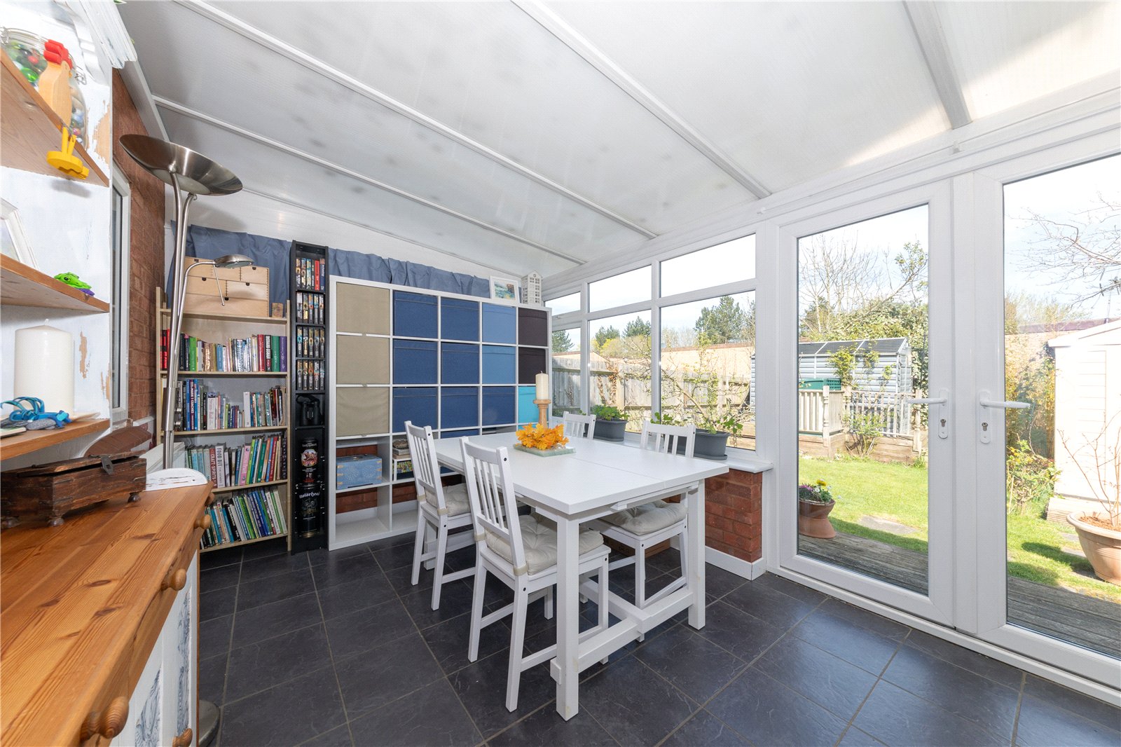 Internally, the property boasts a spacious entrance hall with ample space for coats and shoes, off the Hallway leads into the kitchen/breakfast room. The kitchen offers plenty of storage, with built-in appliances including a fridge freezer, oven, and gas hob, plus additional space for other appliances. To the front of the bay window offers space for a breakfast table. The spacious lounge is at the rear of the property and provides access to the conservatory, currently used as a dining room, which extends the living space and offers views of the south-east facing garden. The conservatory opens directly onto the garden, providing a lovely outdoor retreat.