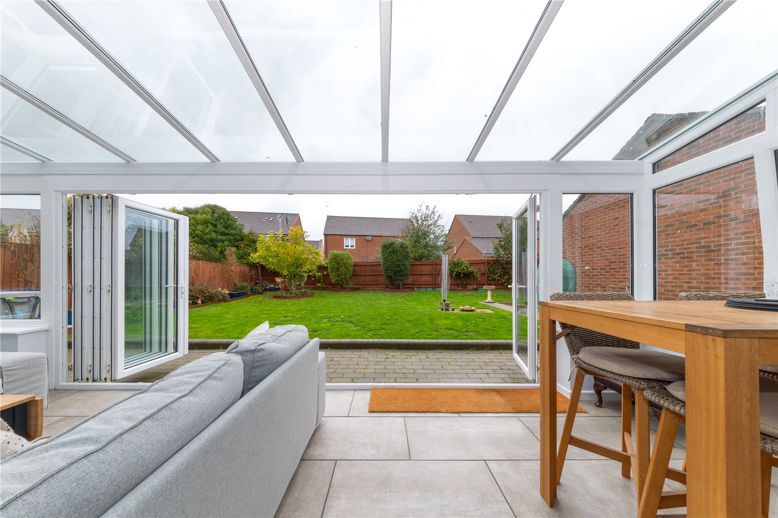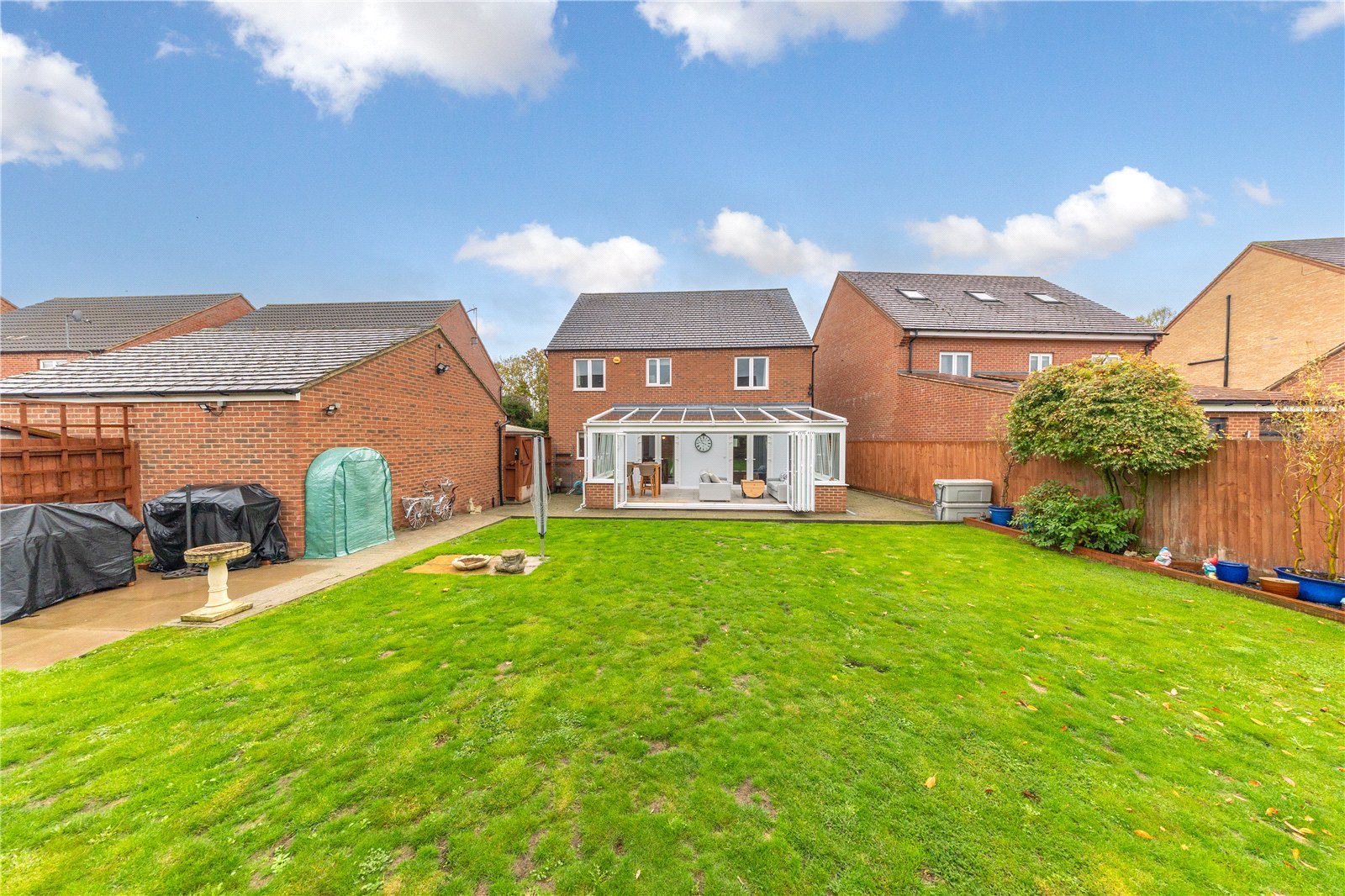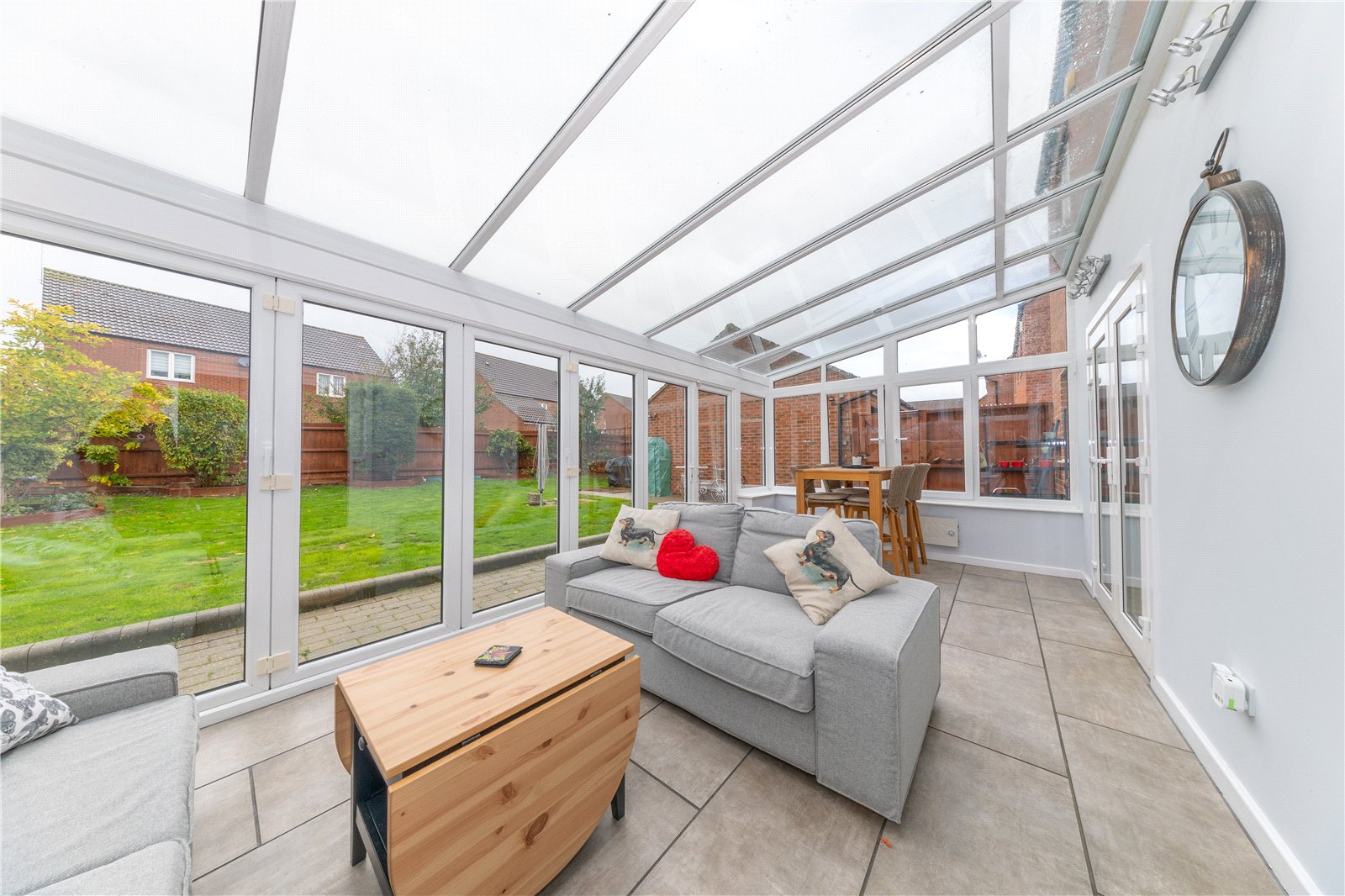 To the rear, you’ll find the impressive 16ft lounge featuring an electric fireplace and ample space for furnishings. Double doors lead seamlessly into the expansive 21ft conservatory, added in 2015, offering a wonderful multi-purpose space for a playroom, sitting area, or additional dining space. The conservatory features large bi-folding doors across the rear, creating a perfect indoor–outdoor flow for entertaining and summer living.