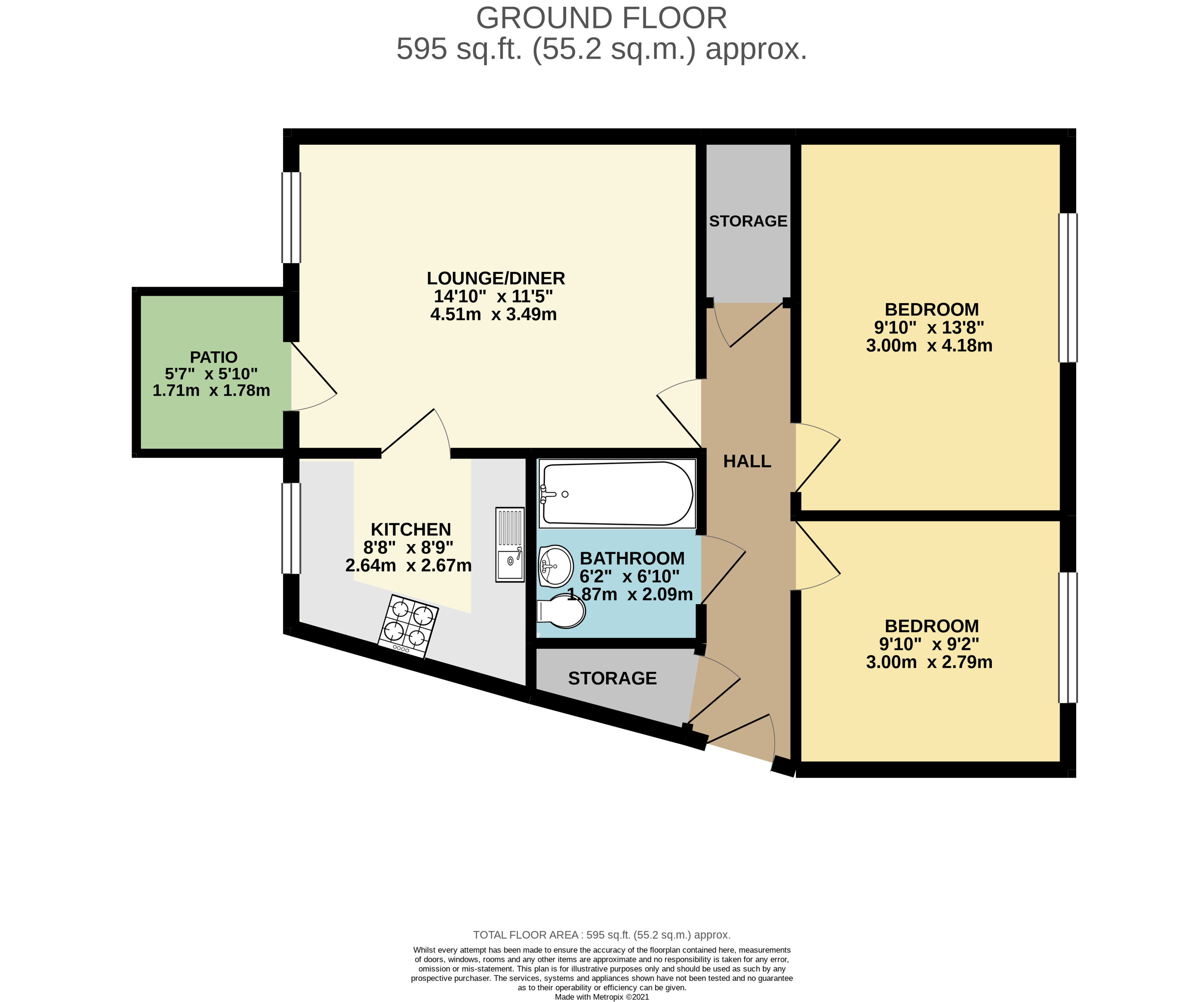 Brief internal accommodation comprises a communal entrance, entrance hallway with two large storage cupboards, two double bedrooms, spacious lounge/diner with doors leading to a private patio, and a fitted kitchen. Externally the property offers allocated parking and secure bike shed.