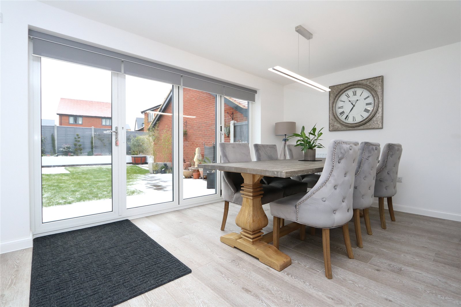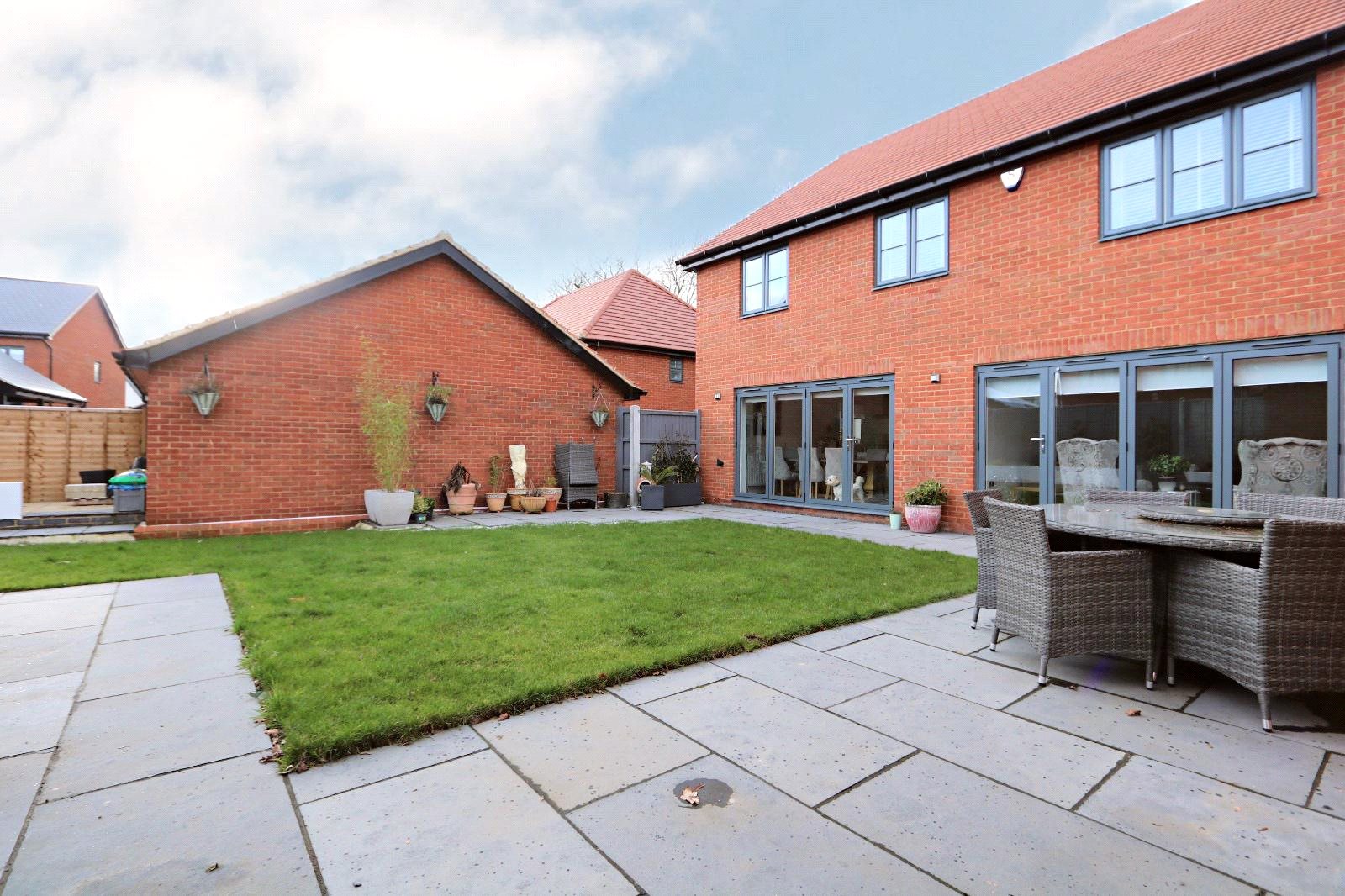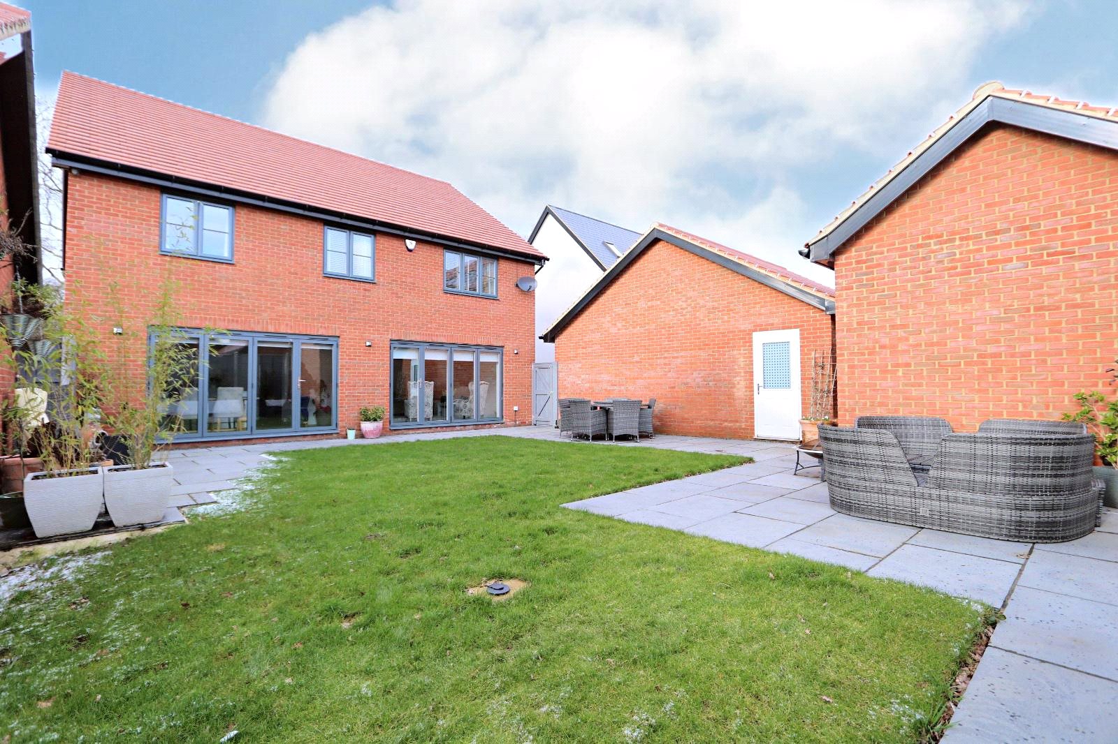 Brief internal accommodation comprises a large entrance lobby with stairs rising to the first floor, bay fronted dining room, fully fitted bay fronted study, guest cloakroom/utility room, spacious living room with bi-folding doors and a stunning and comprehensive kitchen/diner with fitted appliances and bi-folding doors overlooking the garden. To the first floor there is an open, light and airy landing, modern four piece family bathroom, four double bedrooms and two en-suites. The fifth bedroom has been opened up into the master to provide a large dressing area but could be easily restored if so desired. Externally the property boasts a generously sized landscaped rear garden with patio and lawn. To the front there is a double garage and large driveway for up to five vehicles. The front aspect overlooks mature trees and green-land which is protect land.