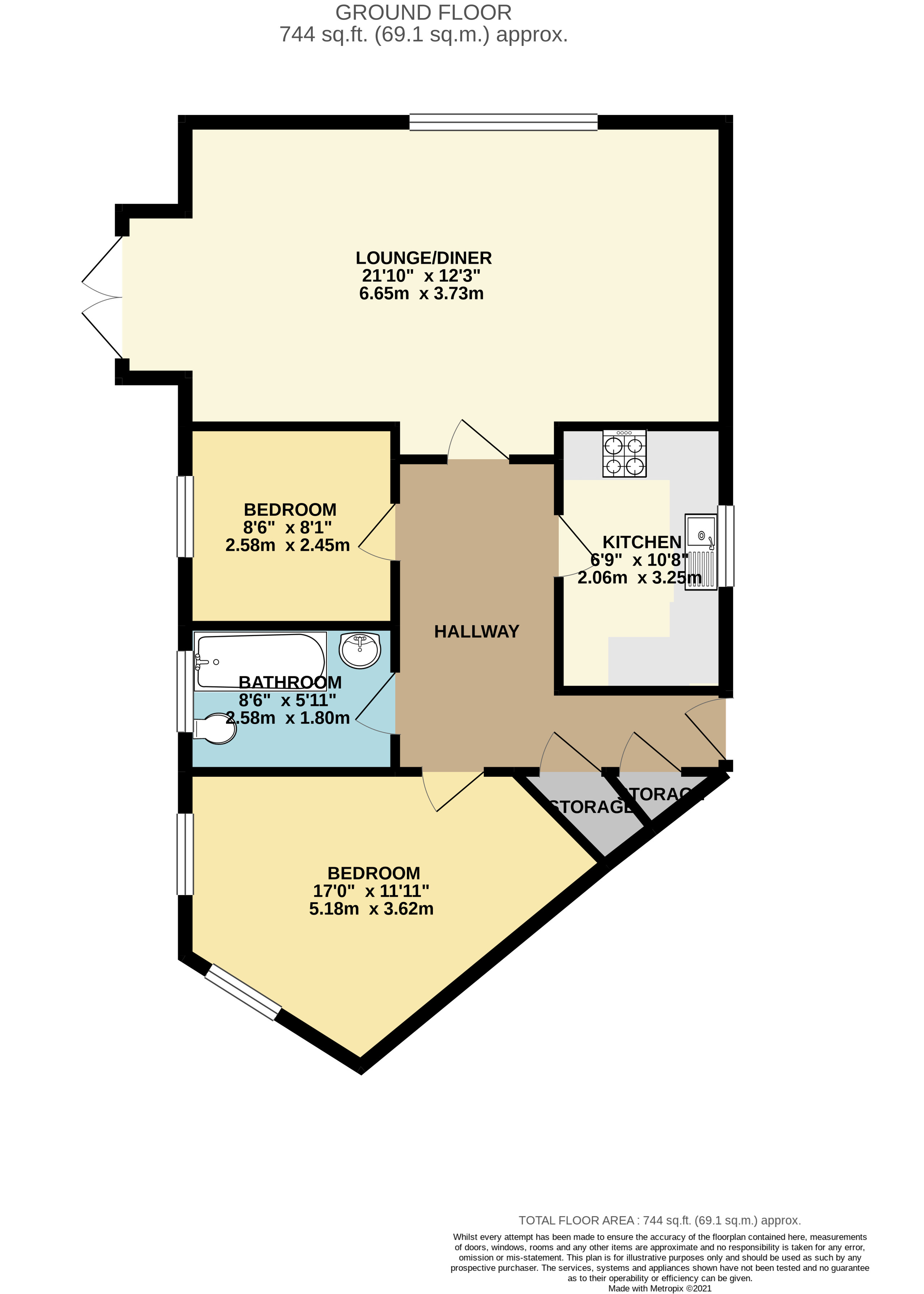 Brief internal accommodation comprises an entrance hallway with large storage cupboards, fitted bathroom, kitchen, two generously sized and well proportioned bedrooms and a spacious, light and airy lounge/diner with double patio doors onto the patio. Externally the property offers allocated parking and ample visitor bays.