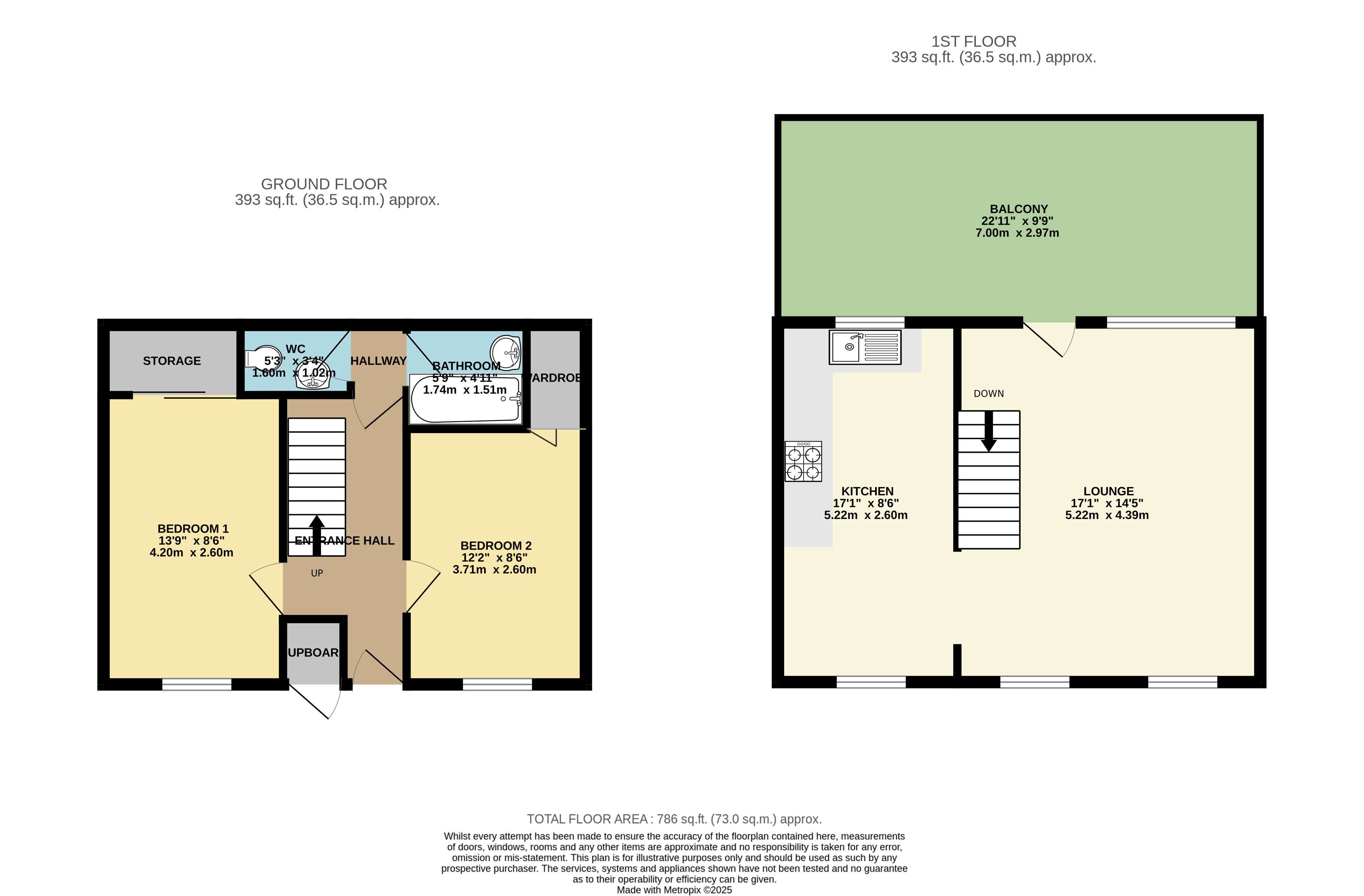 Brief internal accommodation comprises an entrance hallway with two double bedrooms, and separate w/c and bathroom to the ground floor. Then a living room and a kitchen/diner to the first floor. Externally the property offers a private balcony and also boast a garage