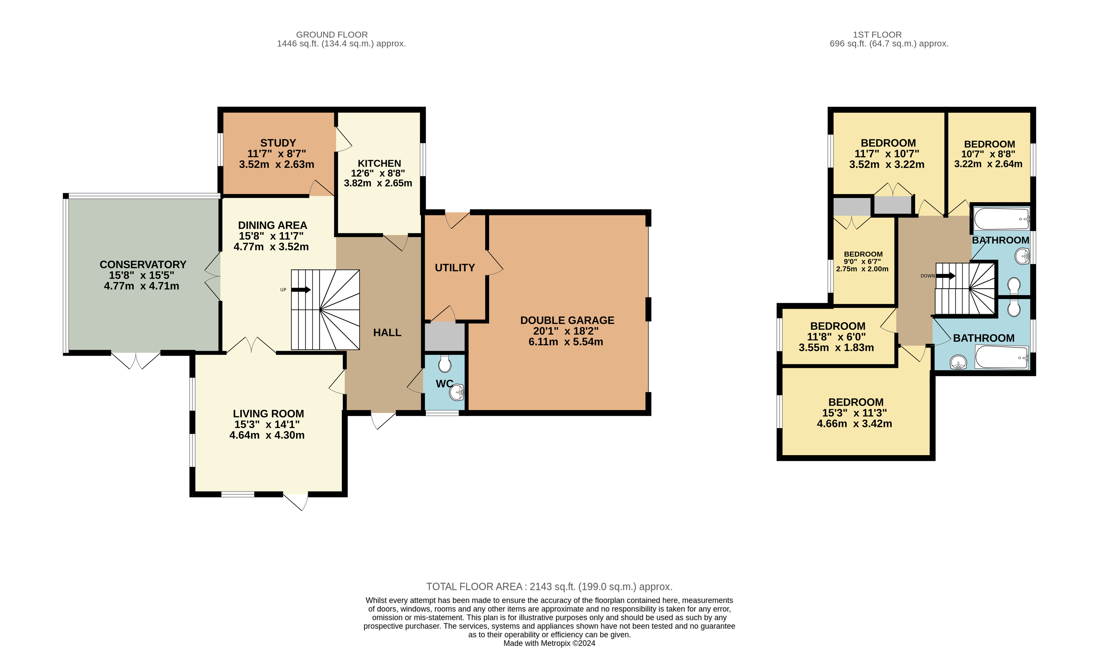 Brief internal accommodation comprises an entrance hallway, guest cloakroom, living room, dining room, study, large conservatory, kitchen and utility room. The first floor offers five bedrooms (the previous master bedroom an en-suite was split) and a family bathroom. Externally the property boasts a double garage and large front & rear gardens.