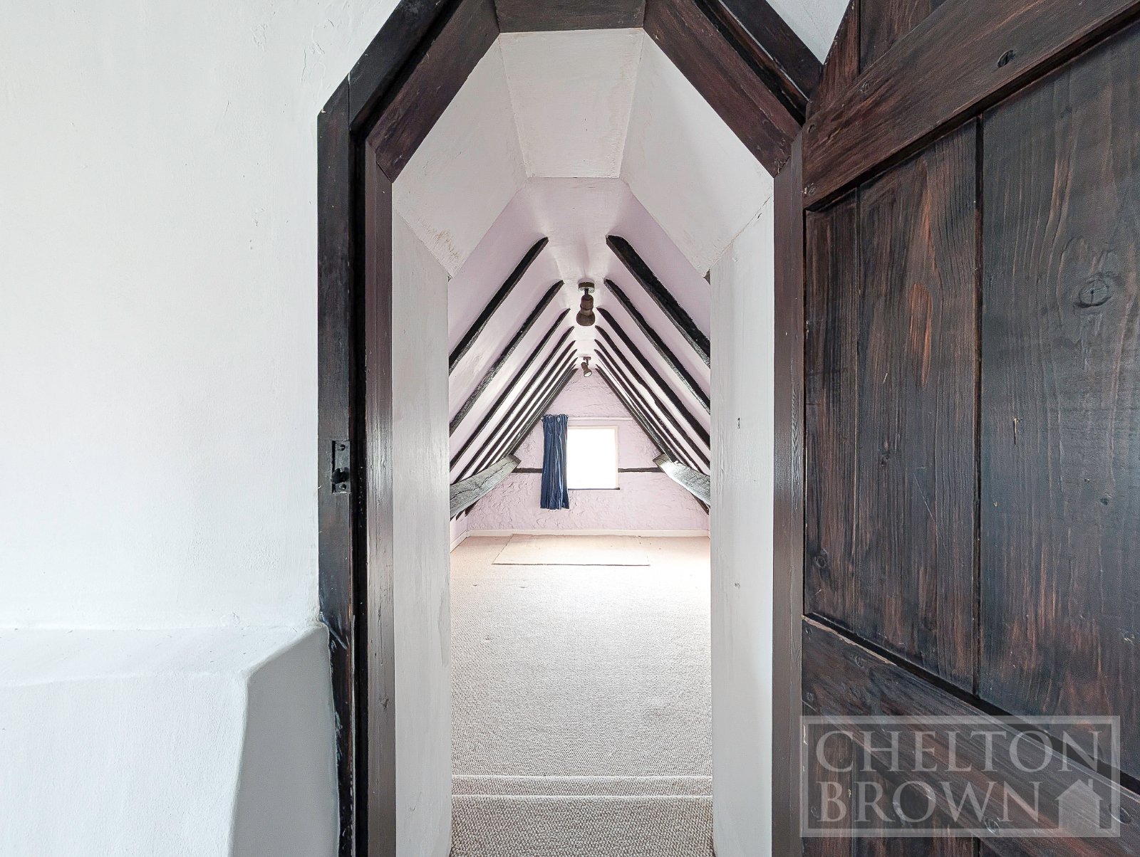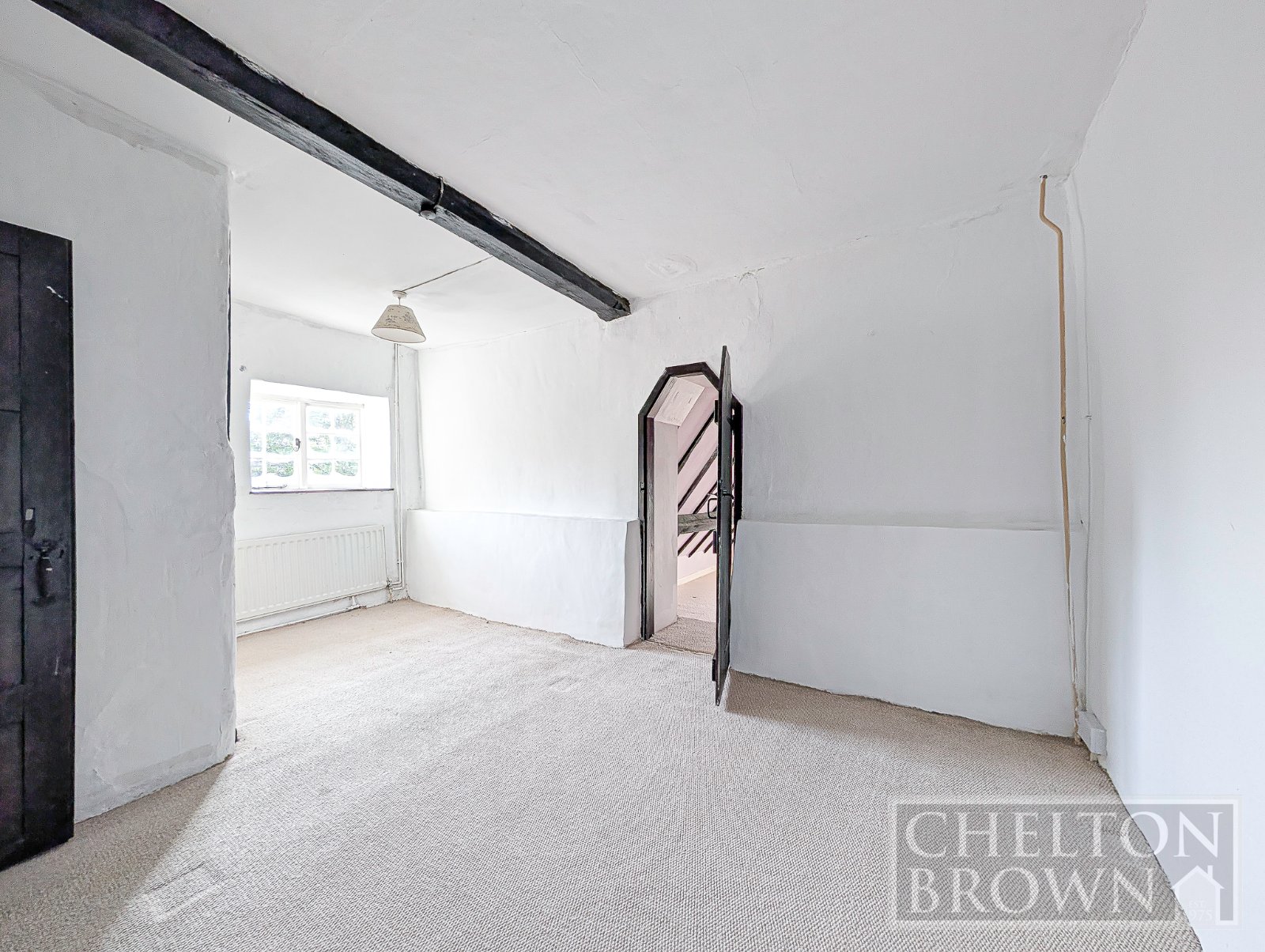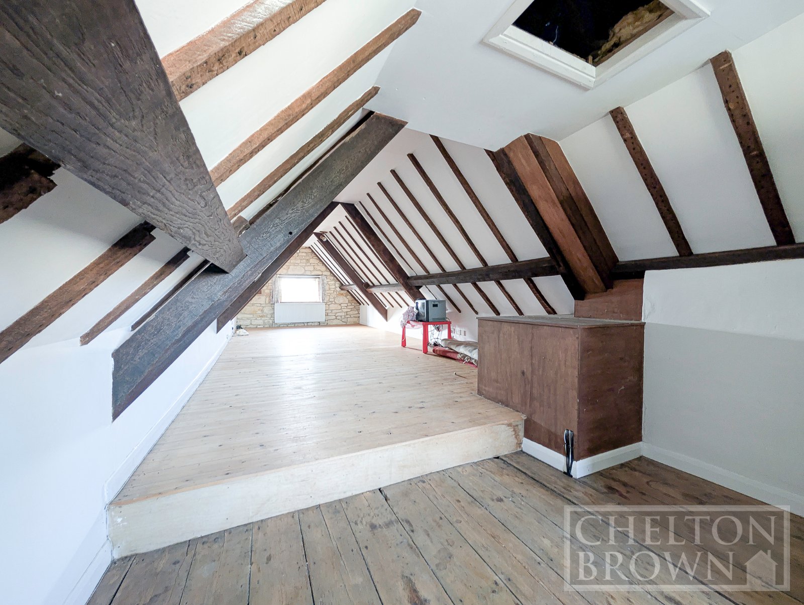 The principal bedroom sits at the front of the property, enjoying views over the field opposite and featuring a striking sandstone fireplace. Concealed behind one of the bedroom cupboards is a hidden staircase a delightful surprise leading up to a substantial attic room. Measuring over 11 metres in length, this versatile space offers enormous potential for a variety of uses, subject to the necessary consents.