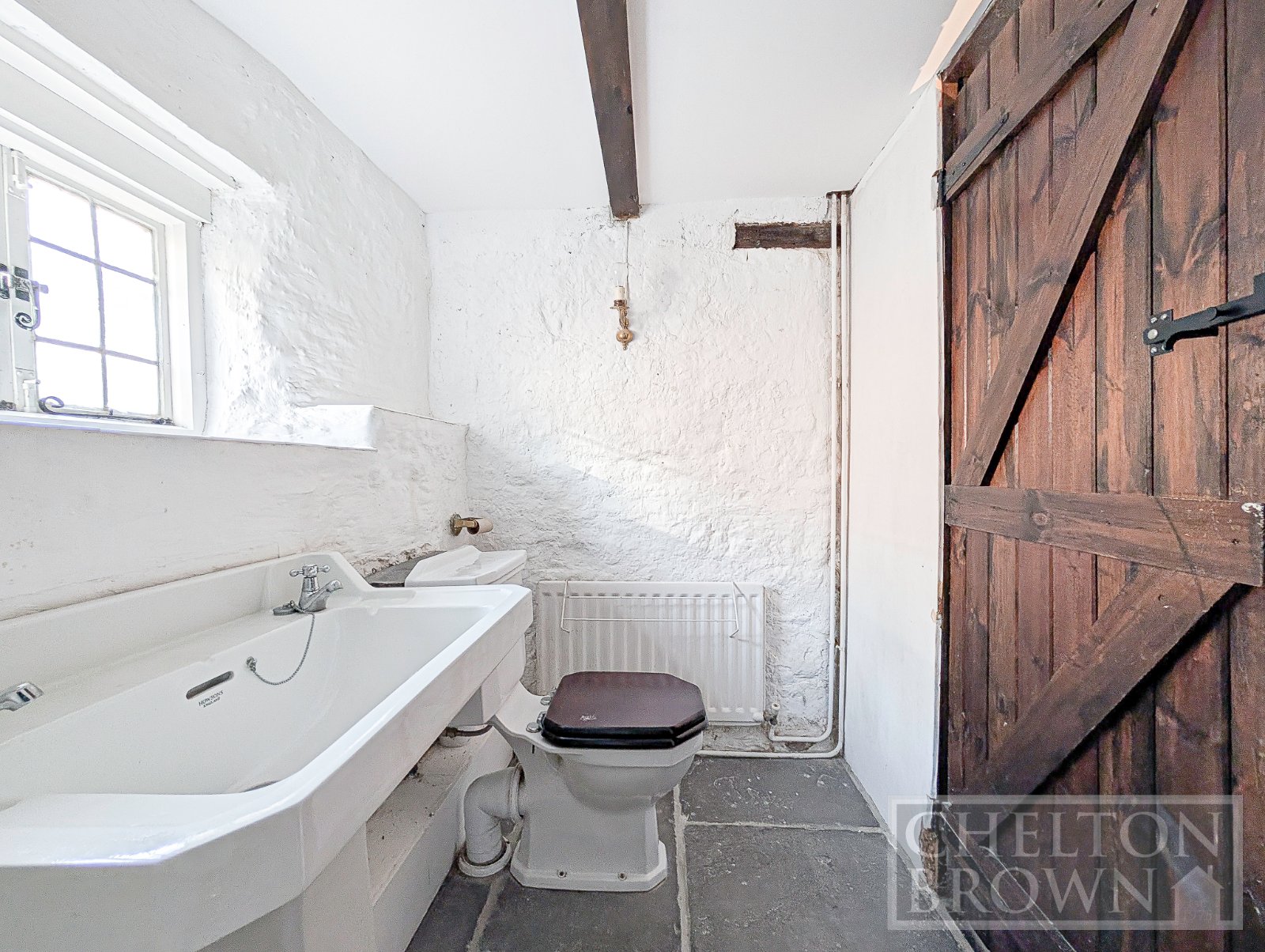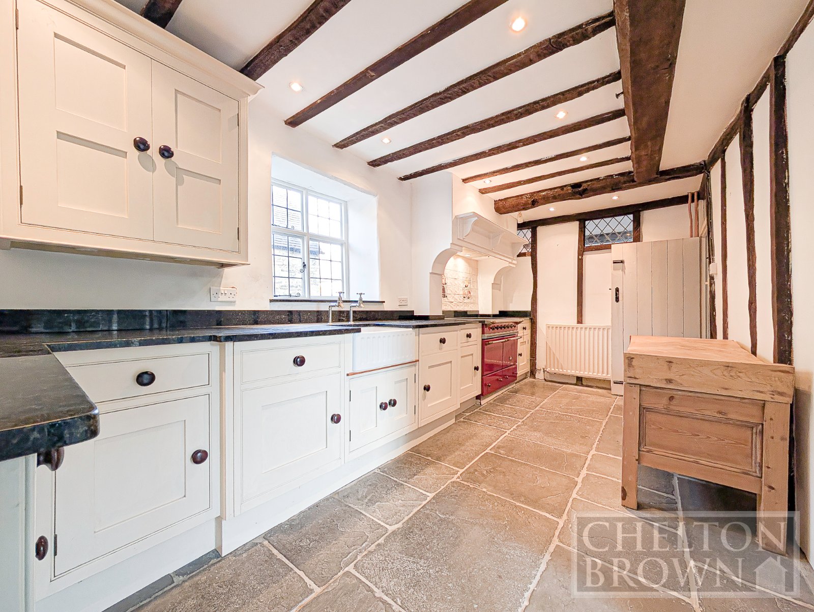 The kitchen is timeless in both style and function, featuring a traditional Belfast sink, an impressive range oven, and a charming butcher's block. Ample storage and worktop space make this an excellent area for preparing meals for family and friends. A door leads directly onto the patio, making summer entertaining effortless. Beyond the kitchen, a small rear hall provides access to a convenient ground-floor WC and a boiler/utility room.