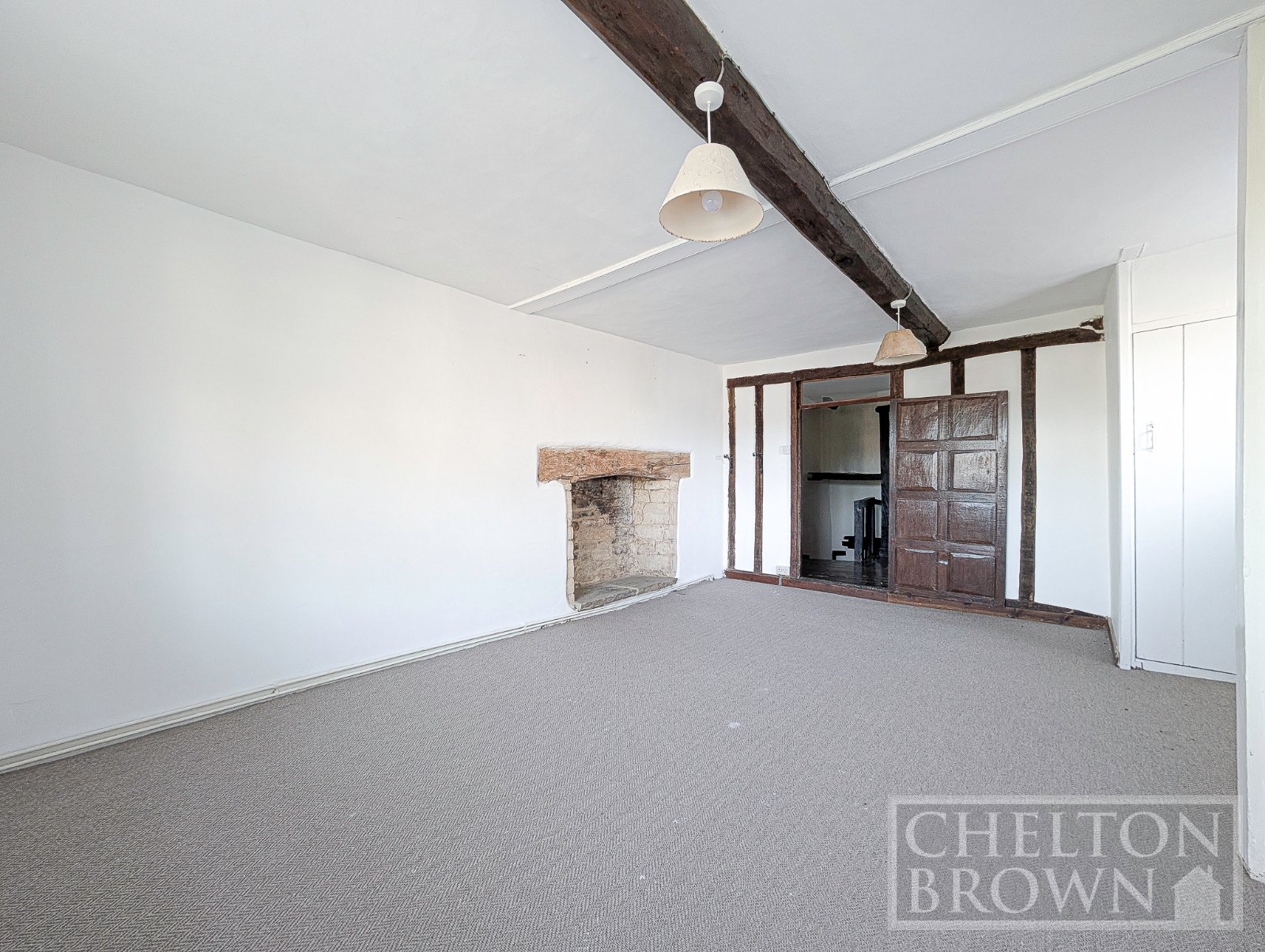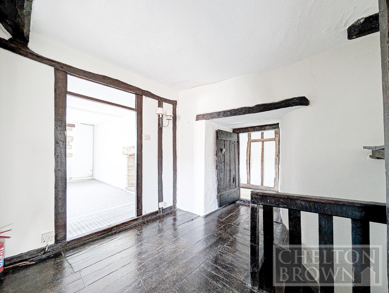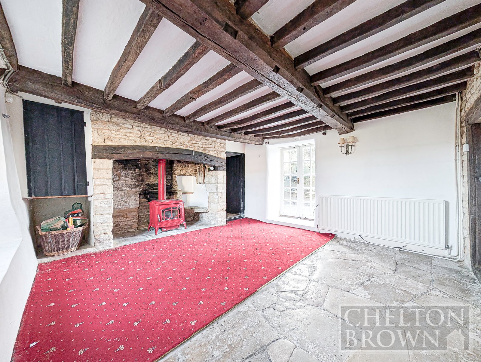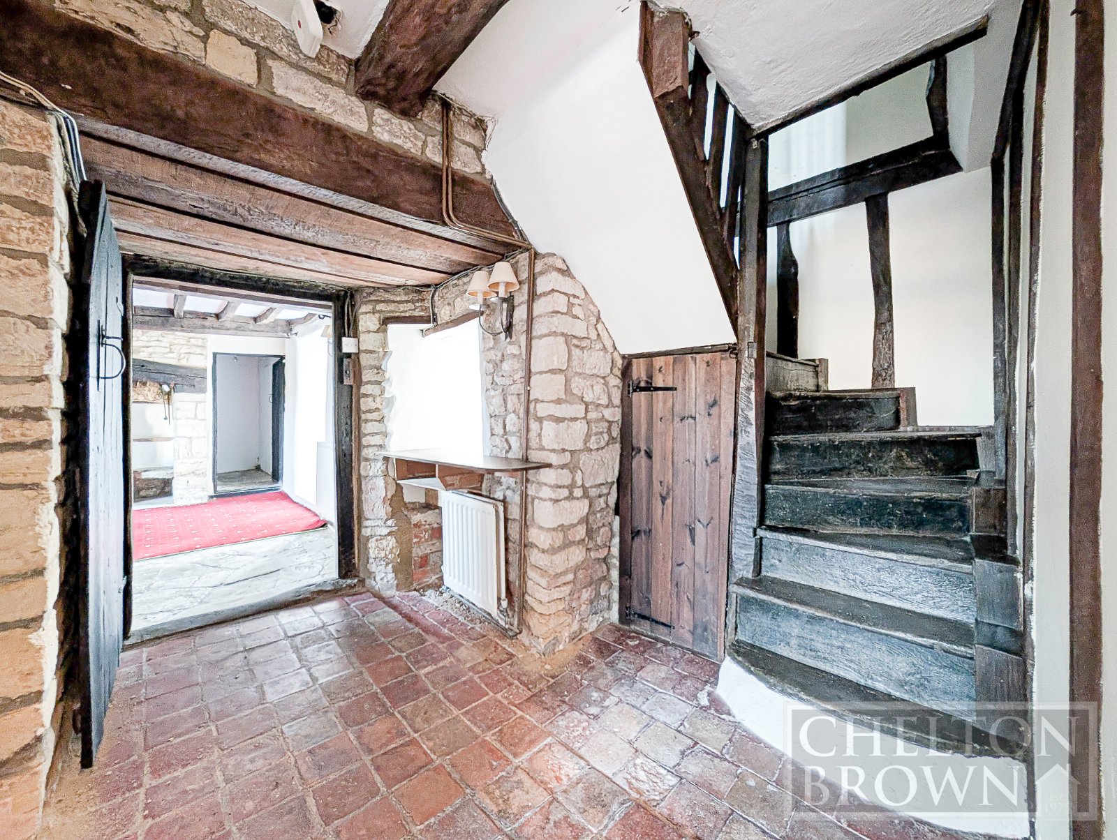Stepping inside, you are welcomed into the first of two reception rooms, a warm and inviting space featuring French doors opening directly onto the garden, along with a beautiful inglenook fireplace, now enhanced by a feature log burner. From here, an internal hallway reveals one of the home's most striking features a stunning Tudor staircase, where centuries of craftsmanship and history are embedded into every timber.