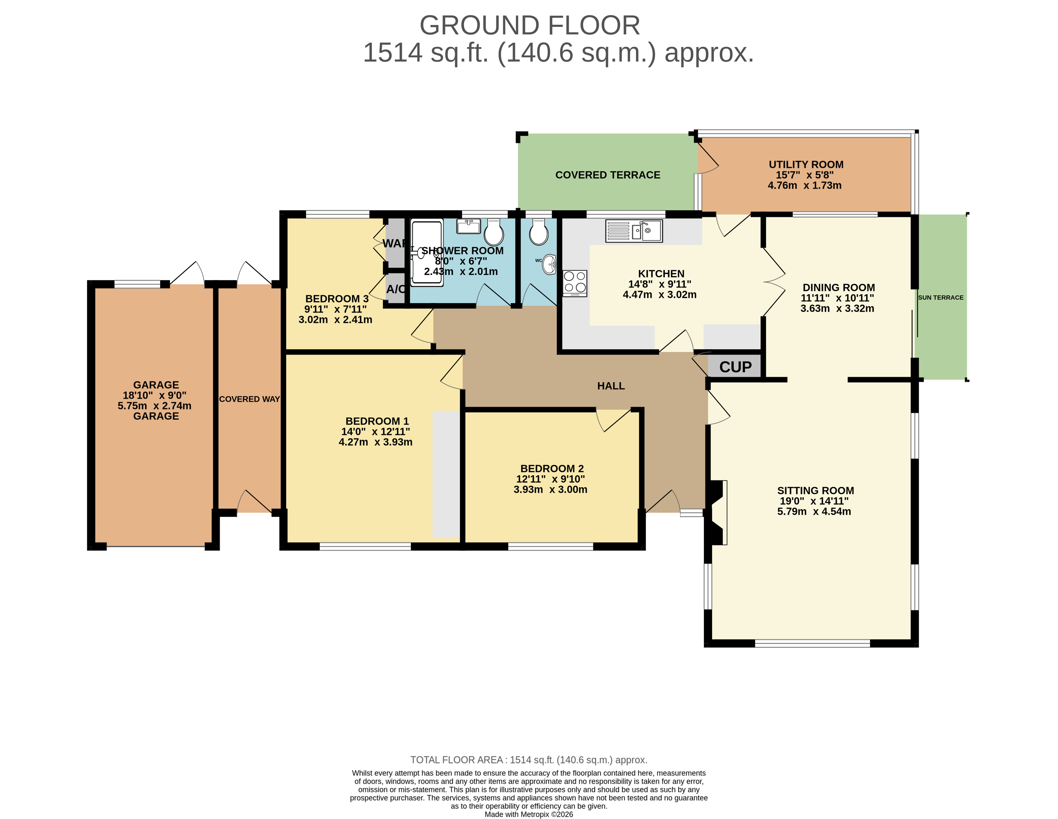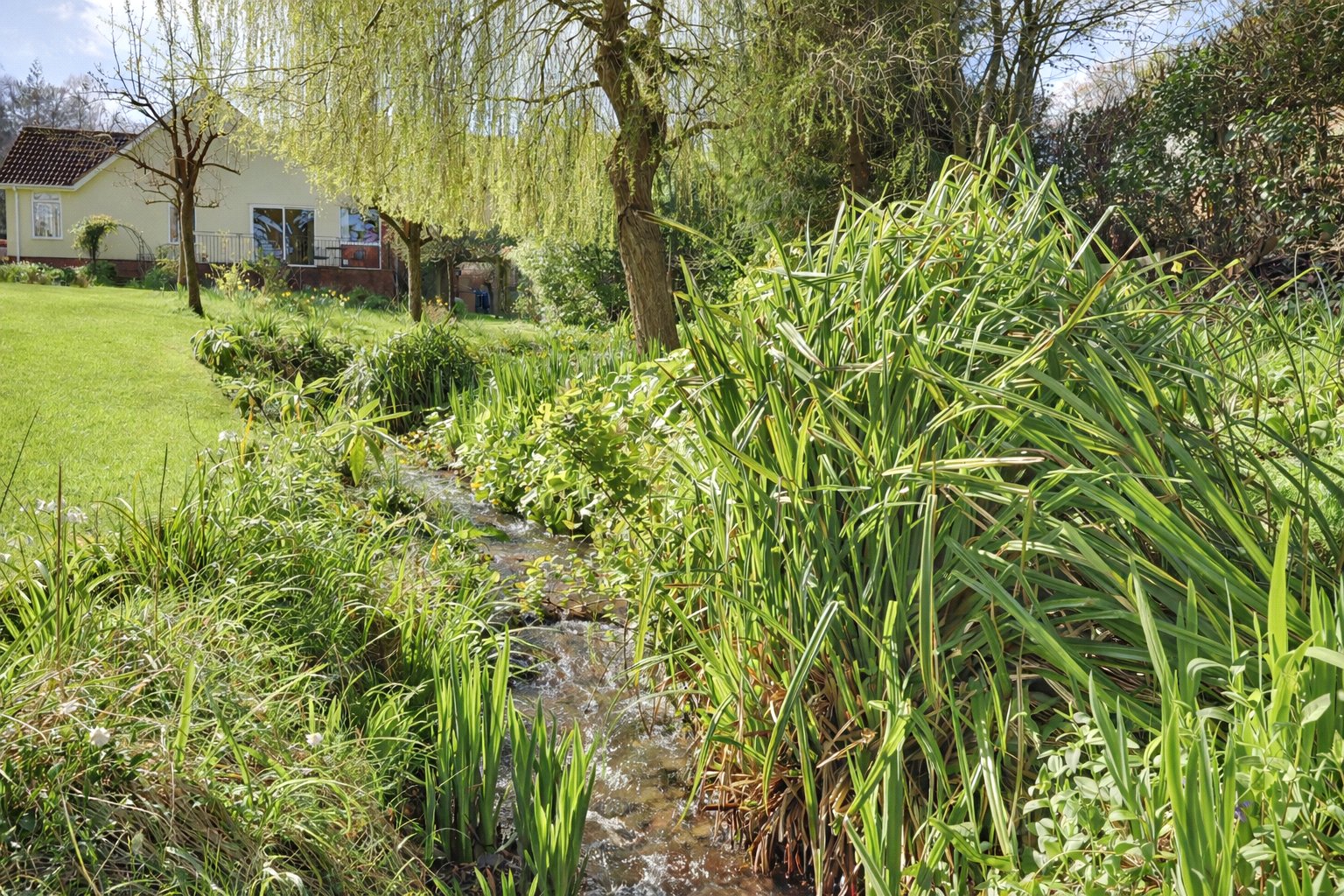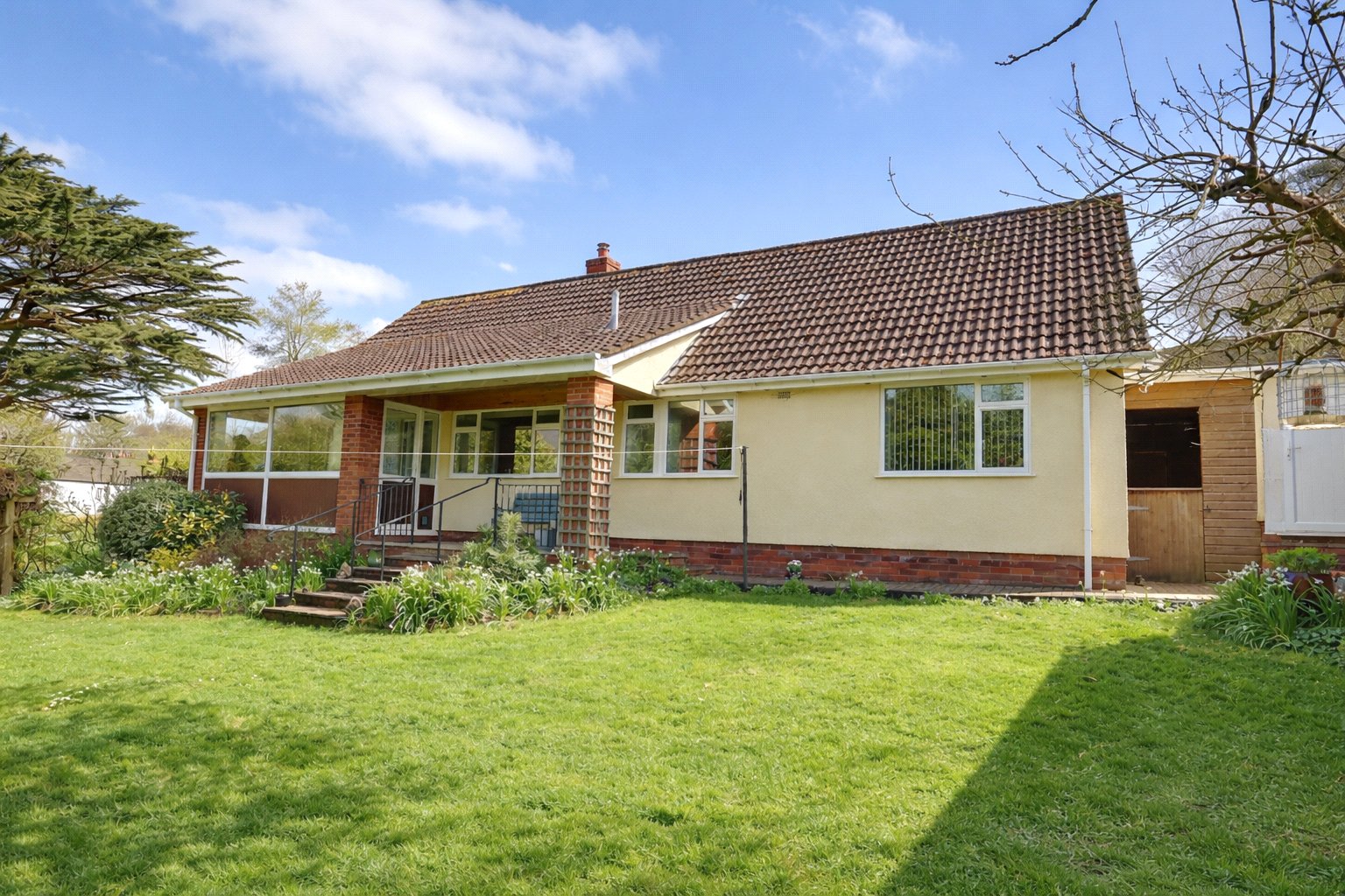 The property is approached through a timber five bar gate with a pedestrian gate alongside onto a large tarmac drive and forecourt providing additional parking and turning facilities in front of an attached single garage. Brick paved pathways lead off to the front entrance and around the side of the property. The gardens extend to approximately 0.6 of an acre are in the main laid to sweeping lawns with pond with rockery, inset trees including a large mature fir tree, fruit trees, weeping willows all enclosed by mature hedging with the feature of a stream running through close to the boundary. A footbridge over the stream towards the bottom of the garden gives access to a vegetable garden with timber garden shed and greenhouse. Immediately to the rear of the bungalow is a covered terrace providing a lovely seating area overlooking the rear gardens which are private and laid to lawn gently sloping down to the stream with well stocked shrub borders, bamboo, a paved patio area, two timber sheds and timber pergola with climbing plants linking the main garden. There is a personal door to rear of the garage and a useful covered way between the bungalow and the garage.