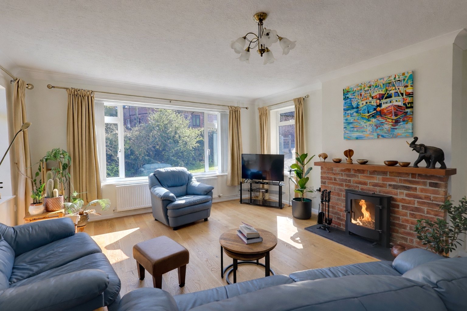 The accommodation in brief comprises a recessed entrance porch with double glazed door leading through to a welcoming to reception hall with oak flooring, fitted cupboard, access hatch to roof space and a part tiled cloakroom fitted with a two piece white suite. The superb triple aspect sitting room overlooks the gardens and features a brick fireplace with timber mantle, slate hearth and wood burner and oak flooring flowing through to a double aspect dining room with sliding double glazed doors to terrace and gardens and double opening doors to a modern fitted kitchen