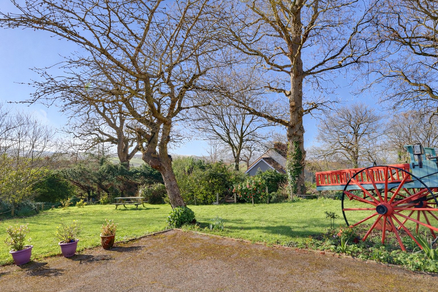 The property stands in large surrounding and interesting gardens offering privacy and seclusion and is approached over a tarmac drive leading to the garage, parking and turning area. The front and side gardens are laid predominantly to lawn with flower and shrub beds and borders with trees to boundaries. To the rear is a further lawned garden with summerhouse, timber decked terrace, a number of fruit trees and soft fruit bushes. Alongside and adjoining the garage is a range of useful timber buildings suitable for a variety of uses.