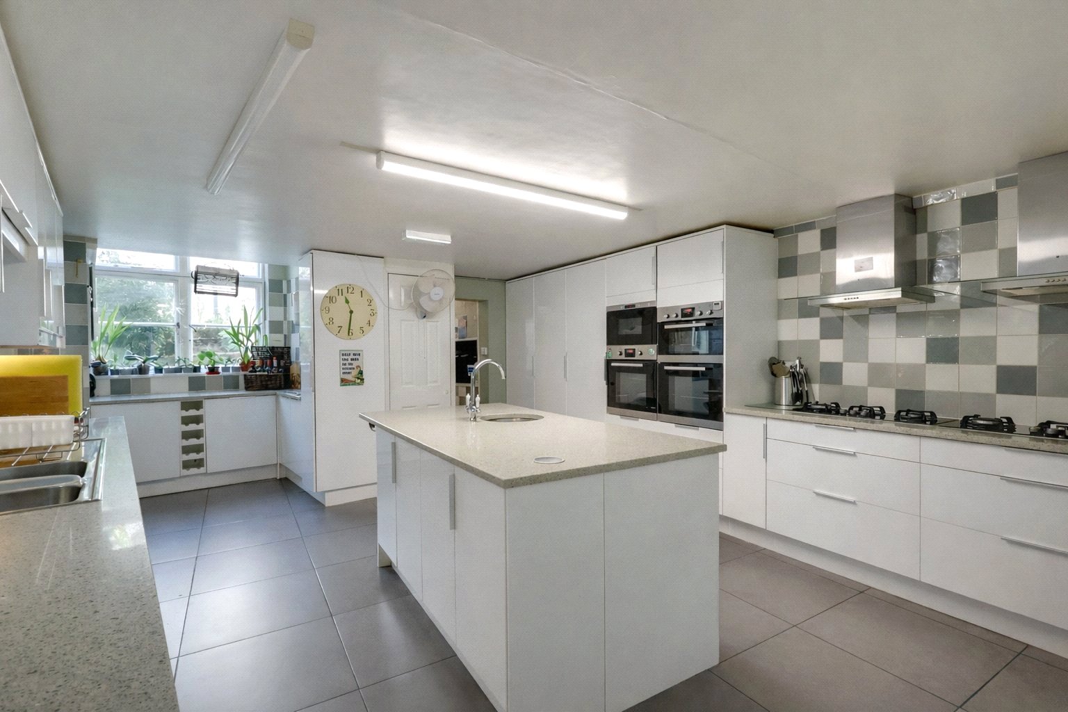 An impressive owners sitting/dining room has double doors to the garden and is accessed off an inner hall where there is also a separate W.C and store room. A large modern fitted kitchen to the rear is well equipped with an excellent range of base, wall and tall units with Quartz work tops, stainless steel double bowl single drainer sink unit, matching island with stainless steel circular sink, further similar sink in wash area, integrated appliances to include twin triple gas hobs with stainless steel extractor, triple eye level ovens and microwave, two dishwashers, full height fridge and two freezers, two under counter fridges, part tiled surrounds and tiled flooring. Off the kitchen there is an office and shower room fitted with a three piece white and chrome suite and further access to the owners wing where there are two double bedrooms both with vaulted beamed ceilings, a tiled shower room fitted with a three piece white and chrome suite and a utility room with stainless steel single drainer sink unit, plumbing for two washing machines, space for two tumble dryers and doors to garden.