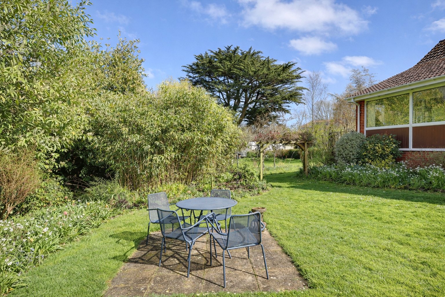 The property is approached through a timber five bar gate with a pedestrian gate alongside onto a large tarmac drive and forecourt providing additional parking and turning facilities in front of an attached single garage. Brick paved pathways lead off to the front entrance and around the side of the property. The gardens extend to approximately 0.6 of an acre are in the main laid to sweeping lawns with pond with rockery, inset trees including a large mature fir tree, fruit trees, weeping willows all enclosed by mature hedging with the feature of a stream running through close to the boundary. A footbridge over the stream towards the bottom of the garden gives access to a vegetable garden with timber garden shed and greenhouse. Immediately to the rear of the bungalow is a covered terrace providing a lovely seating area overlooking the rear gardens which are private and laid to lawn gently sloping down to the stream with well stocked shrub borders, bamboo, a paved patio area, two timber sheds and timber pergola with climbing plants linking the main garden. There is a personal door to rear of the garage and a useful covered way between the bungalow and the garage.