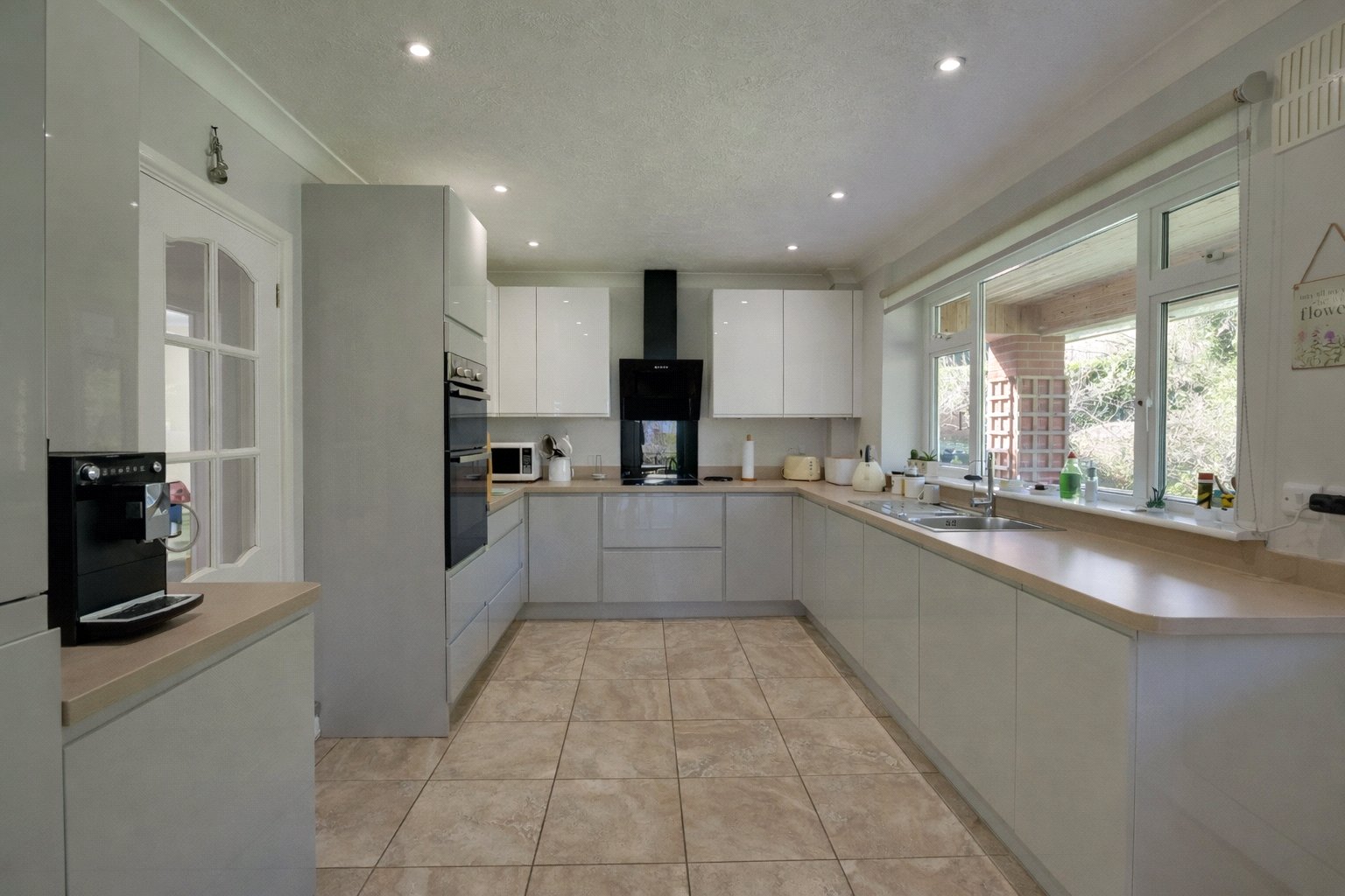 The kitchen Overlooks the rear gardens with views to farm and woodland and is beautifully fitted with a modern range of base and wall units with corner carousels, matching tall larder cupboard, square edged working surfaces with matching upstands, stainless steel one and a half bowl single drainer sink with mixer tap, integrated appliances to include induction hob with glass splashback, extractor hood, eye level double oven, dishwasher, fridge, washing machine, recessed spotlights, tiled flooring and double glazed door to a separate utility room with vinyl floor covering and double glazed door to an outside covered seating area and garden.