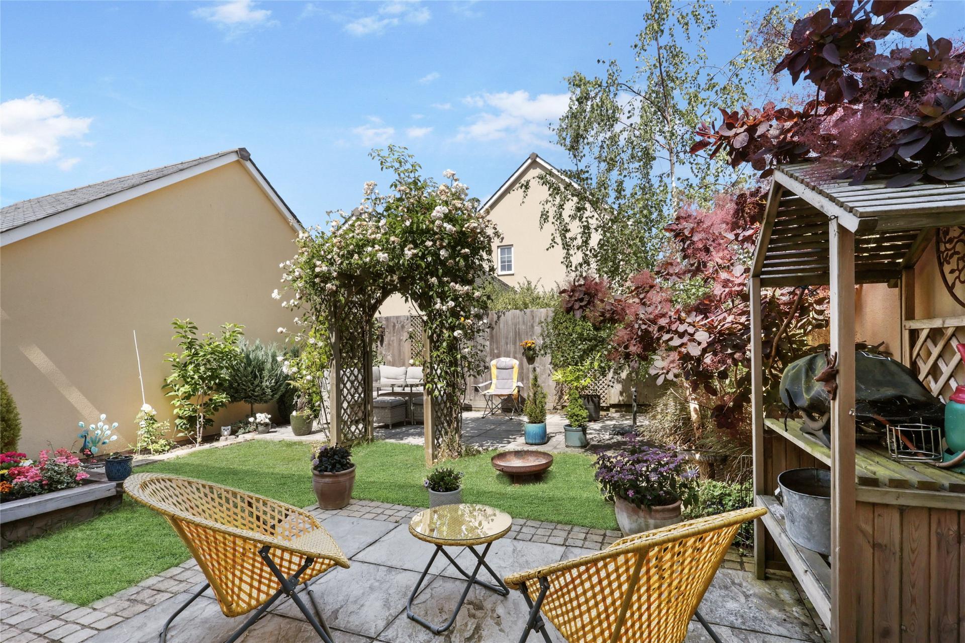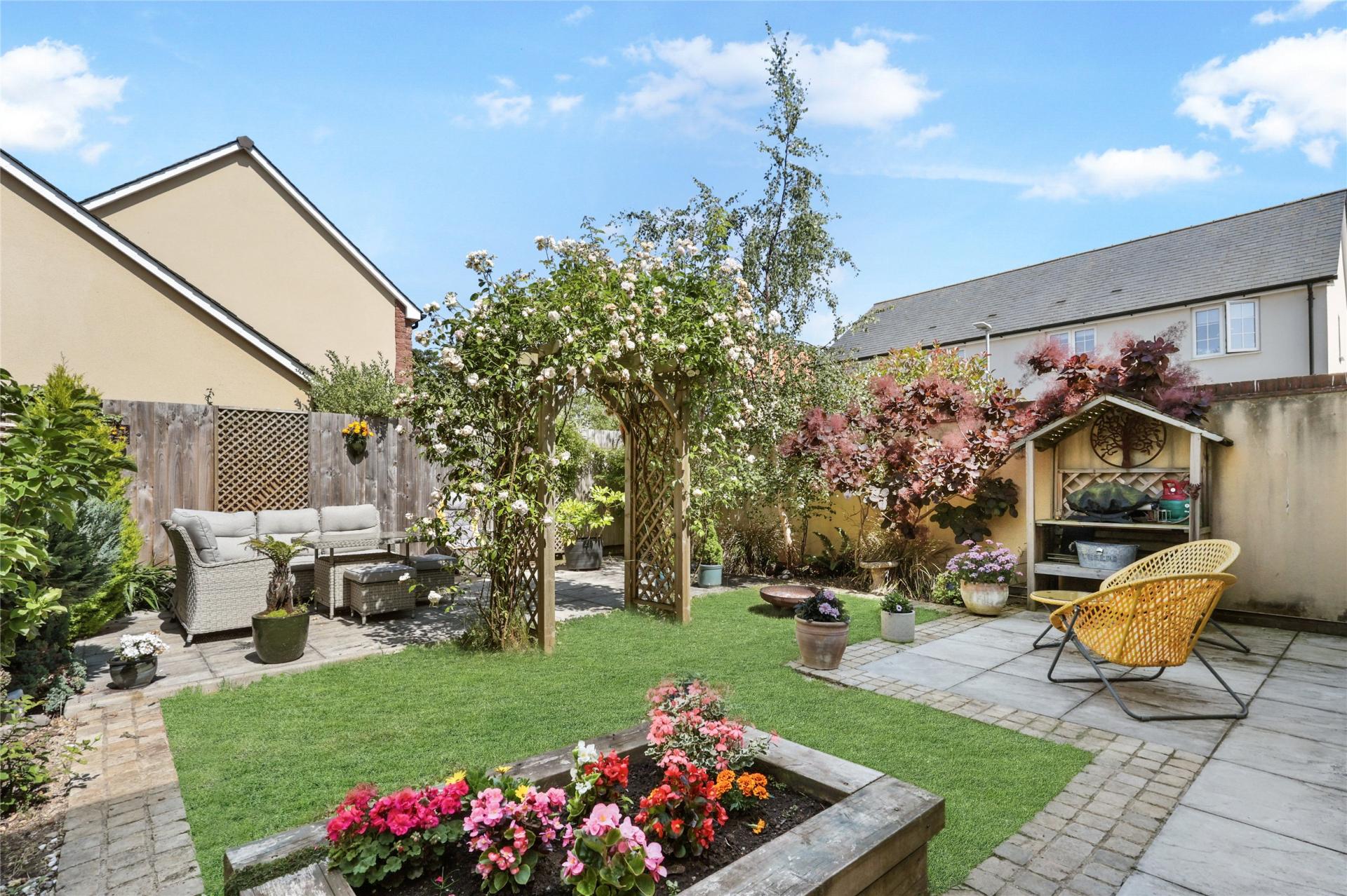 The enclosed landscaped and part walled rear garden enjoys a sunny aspect and is ideal for alfresco dining. Two paved terraces are linked by a lawn with raised flower bed and a timber pergola with climbing roses with shrubs and small trees to the borders.