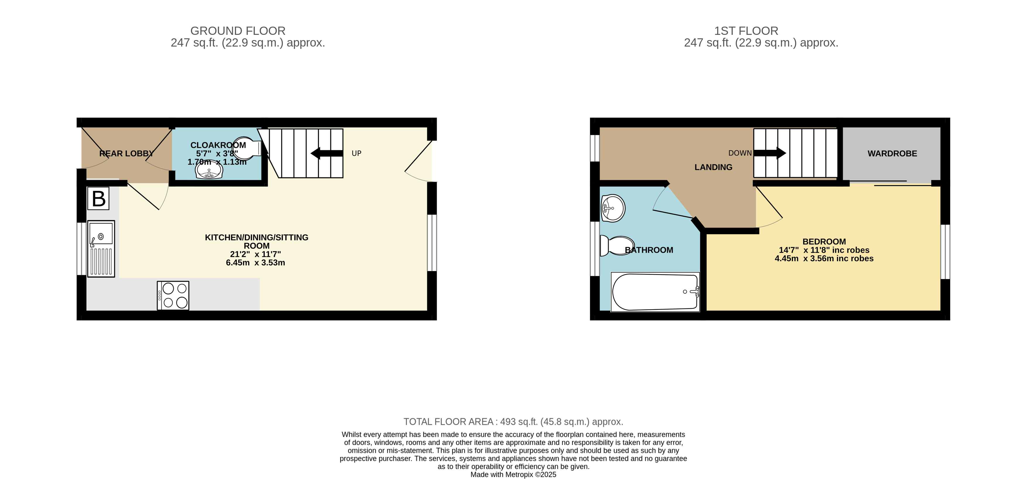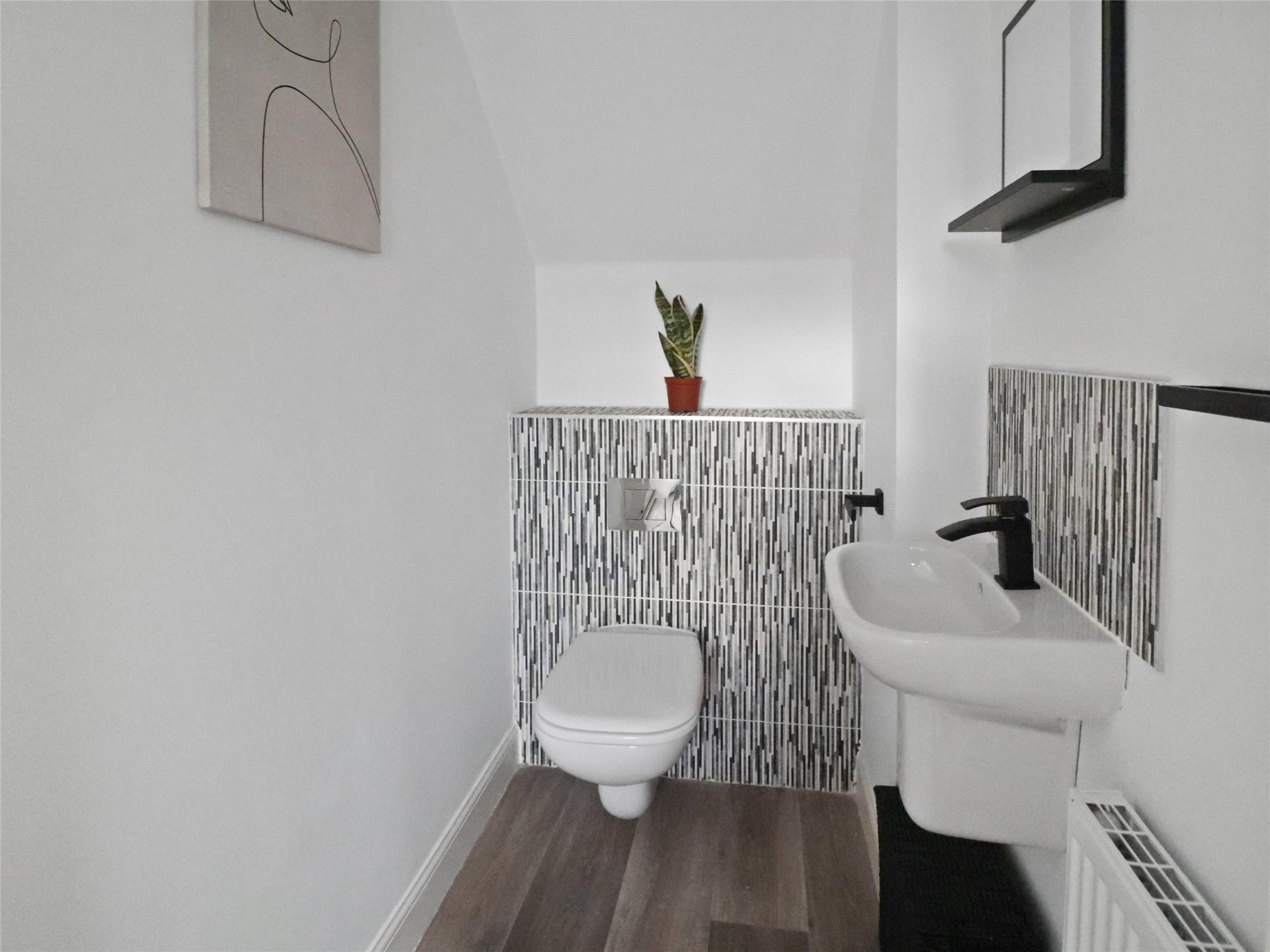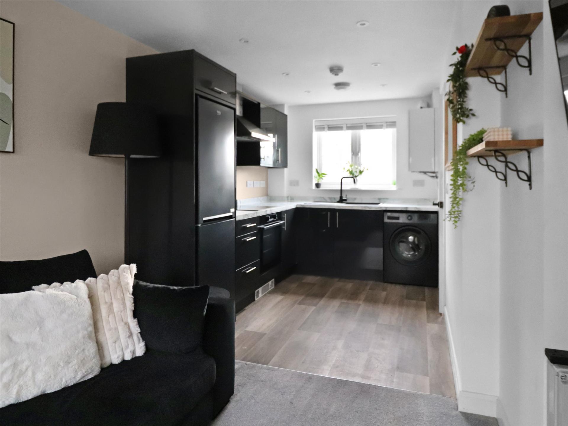 The front door opens into a welcoming open plan sitting/dining/kitchen area. The sitting area features a front aspect window, storage beneath the staircase, and stairs rising to the first floor. The kitchen is fitted with a modern range of wall and base units with work surfaces incorporating a composite sink and drainer with tiled surrounds. Integrated appliances include an electric oven and gas hob with extractor hood over, with further space and plumbing for a washing machine and tall fridge freezer. A wall-mounted gas fired boiler and rear window complete the kitchen. From here, a door leads into the rear lobby with access to the courtyard garden, radiator, and a generously sized cloakroom.