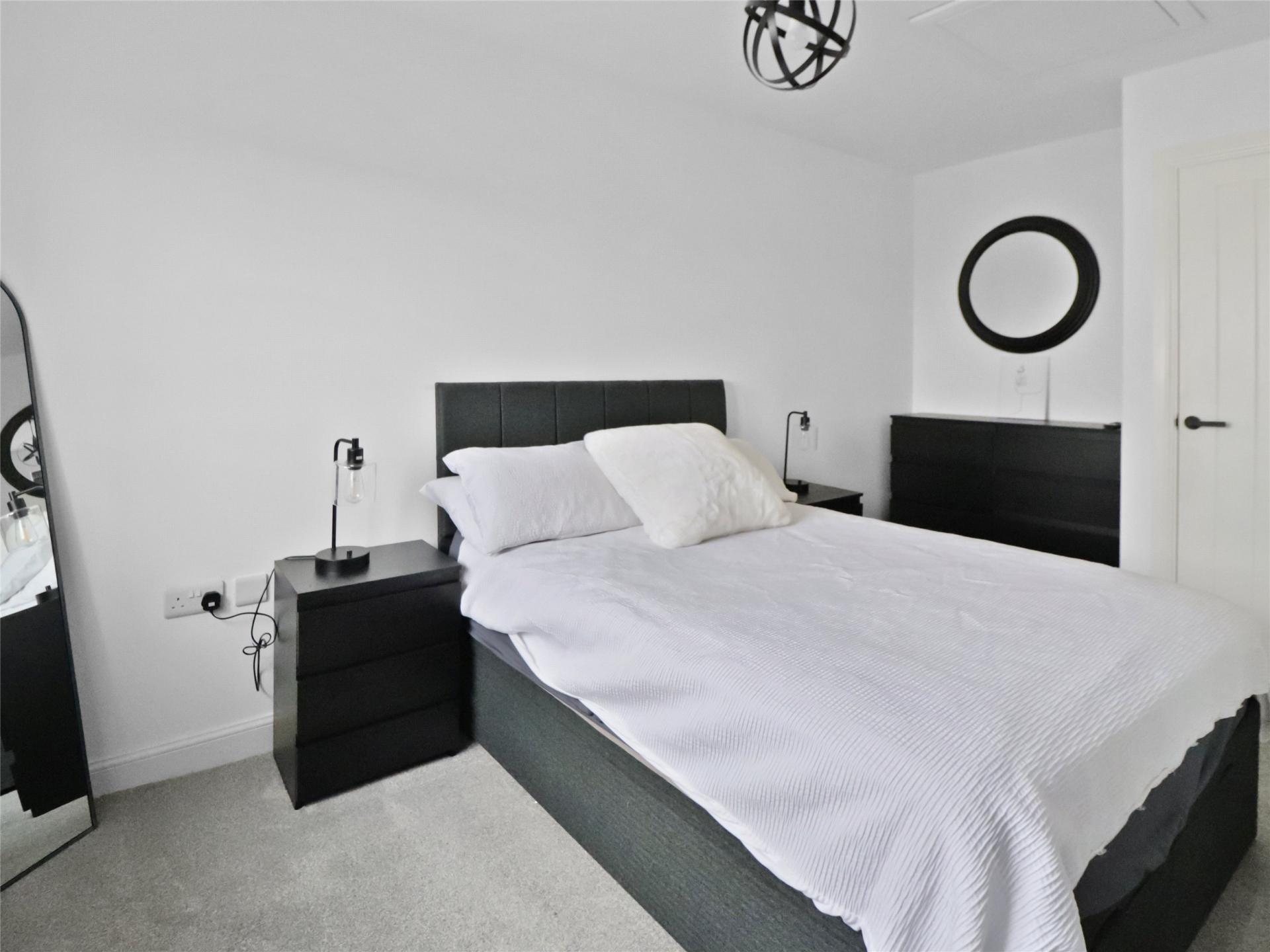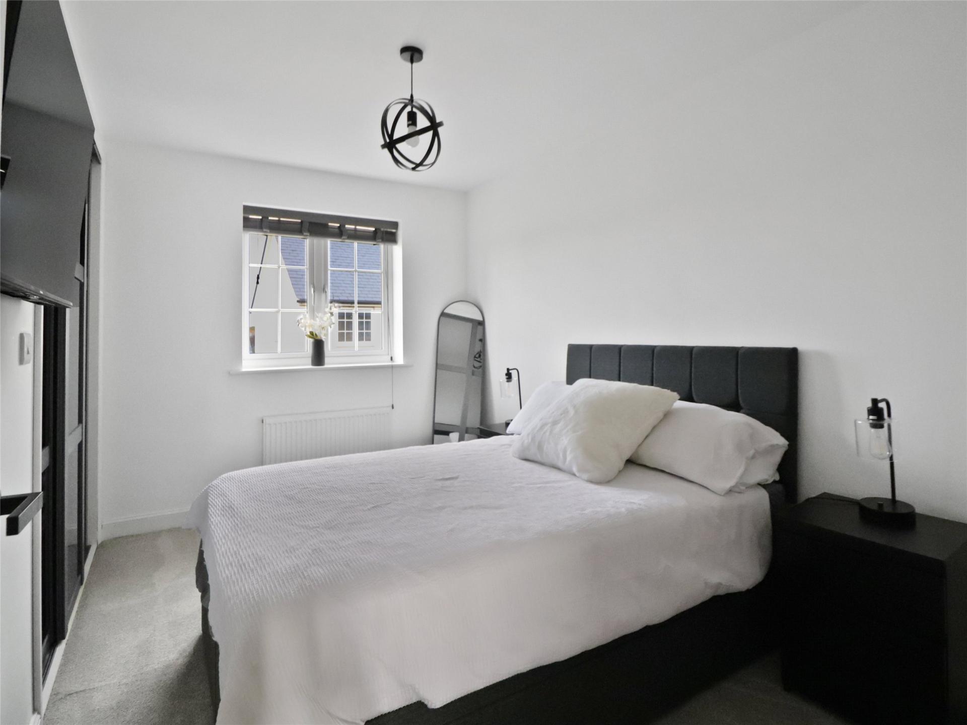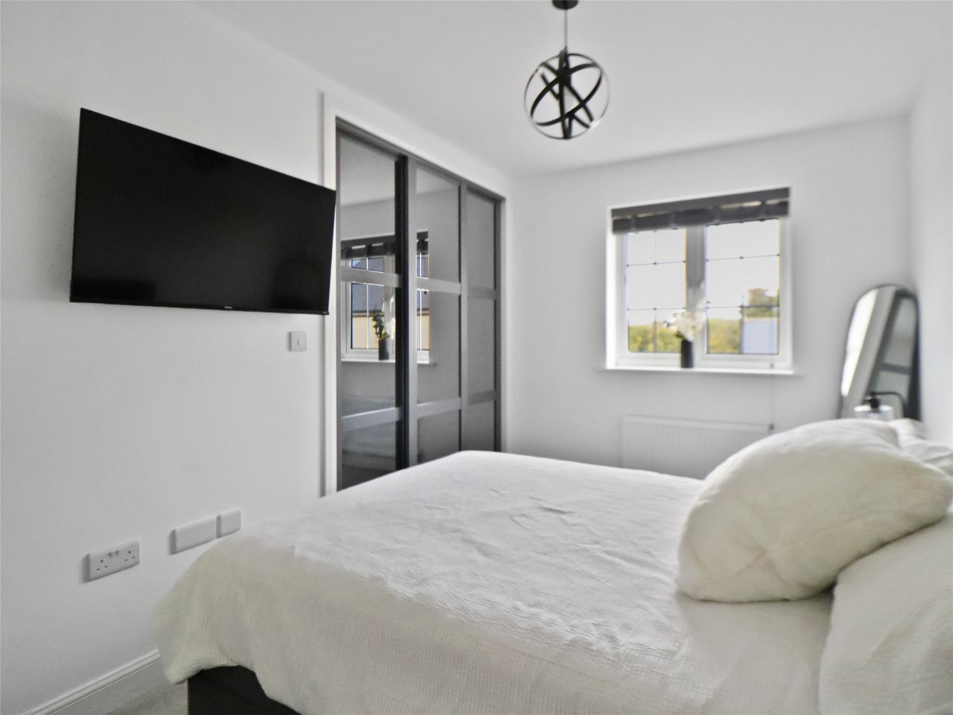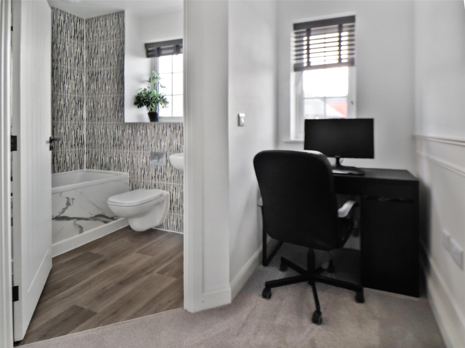 To the first floor, the landing provides useful space for a home office and has a window overlooking the rear. The bedroom is a generous double with a front aspect window and mirrored built-in wardrobes. The bathroom comprises a panel enclosed bath with mains shower over and glass shower screen, concealed cistern WC, and contemporary wall-mounted wash hand basin, together with a heated towel rail and obscured rear window.