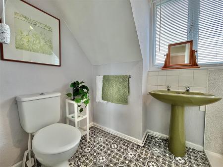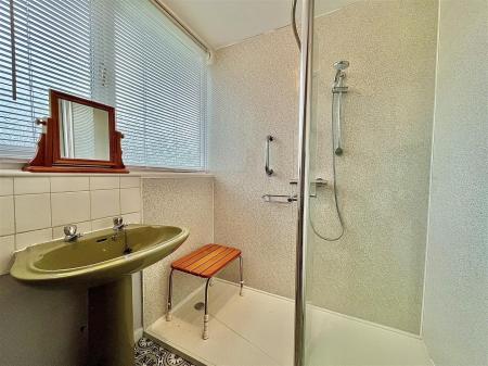 Shower Room - 2.44m x 1.65m (8'00 x 5'05) - Walk-in mains fed shower cubicle with wet board surround, close coupled w.c, pedestal washbasin with tiled splash-backs, radiator, obscured rear aspect window.