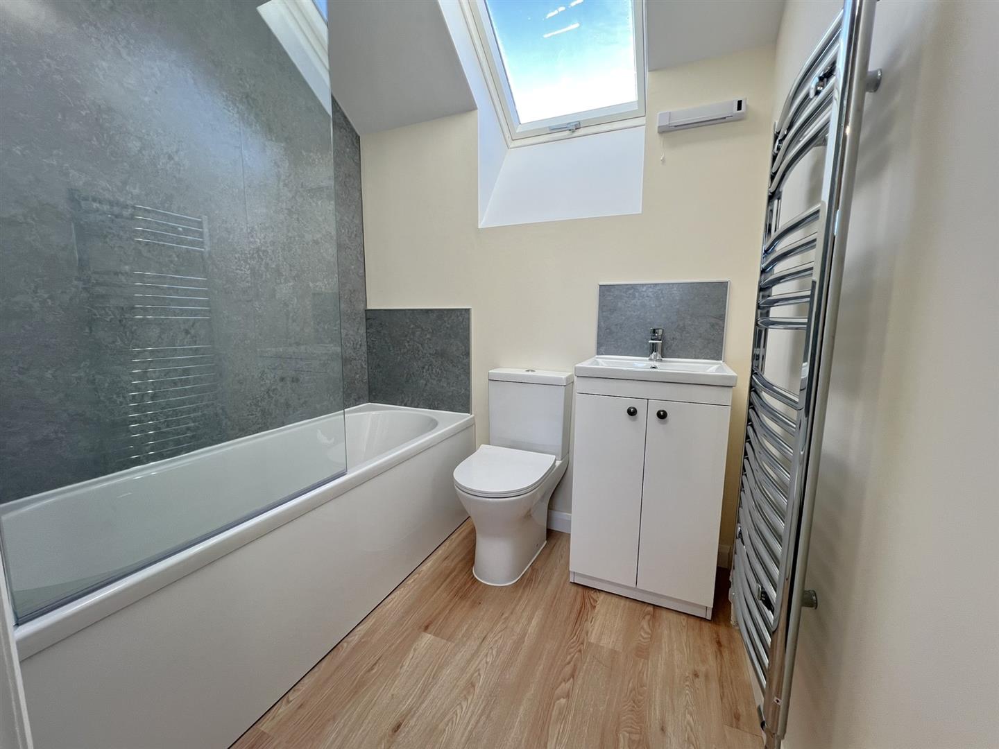 Bathroom - Comprising white suite with modern side panel bath, electric shower fitted over, tiled wall, pedestal wash hand basin with mixer taps, vanity unit beneath, close coupled WC, chrome heated towel radiator, ceiling light, extractor fan, laminate flooring, shaver light and point, rear aspect Velux rooflight.