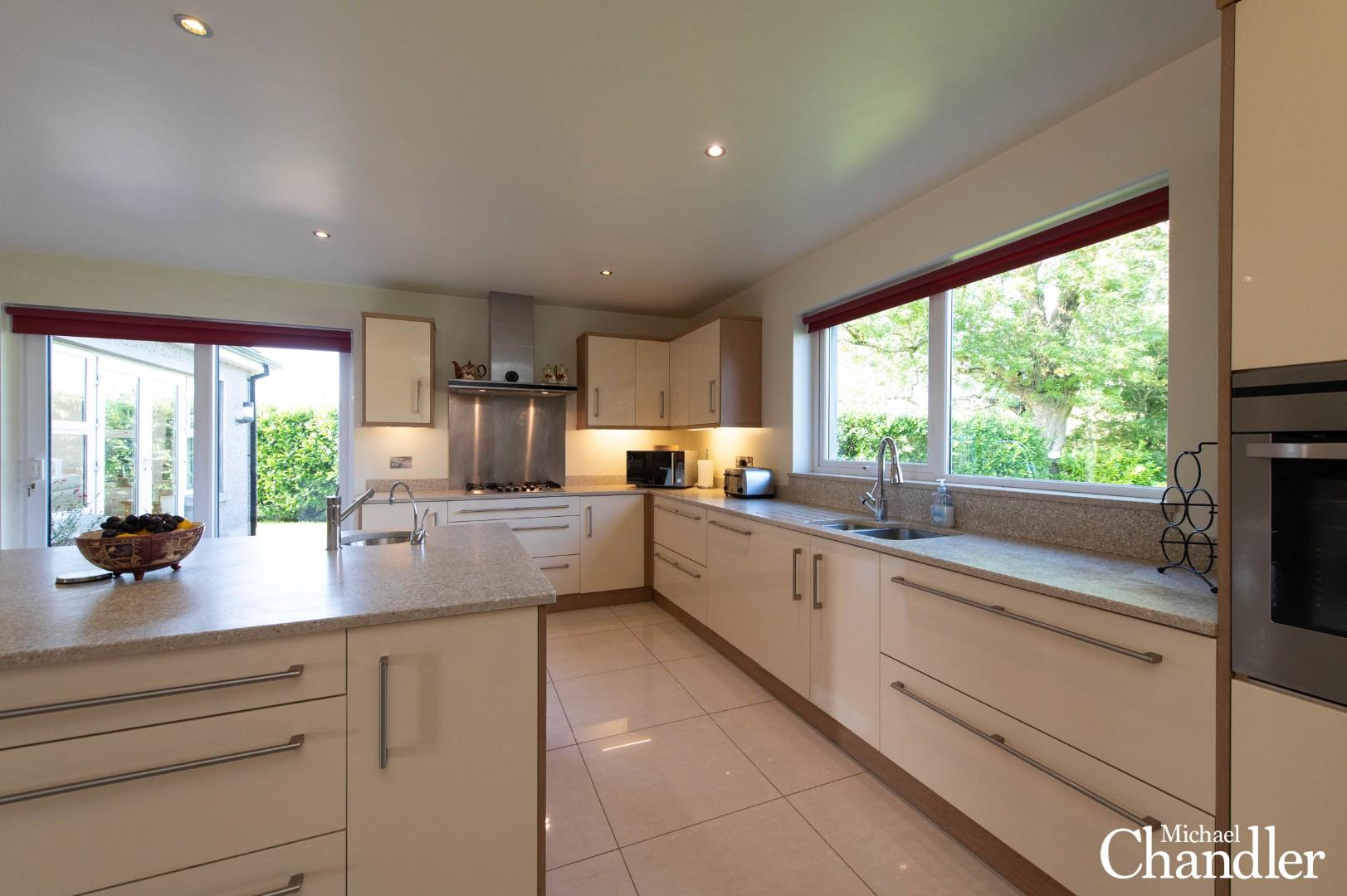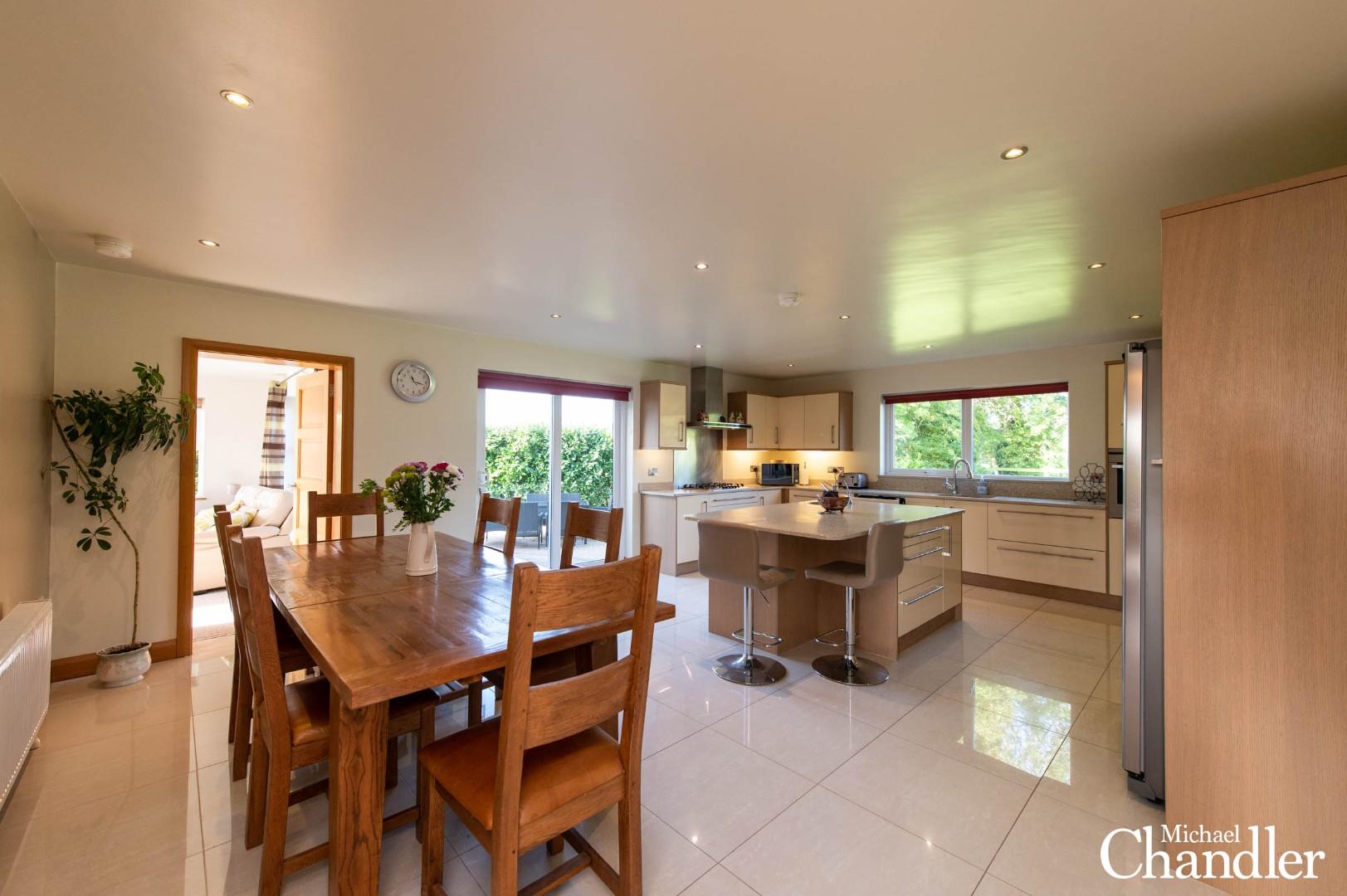 Bespoke modern kitchen with a range of integrated appliances and open plan dining
