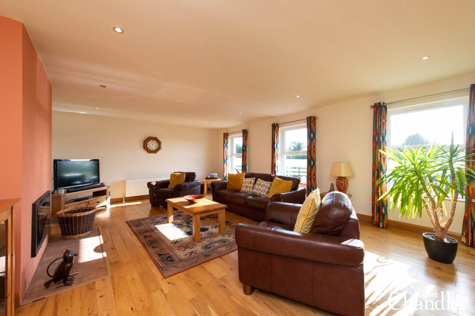 Stunning family lounge with a solid wood oak floor and a Stovax fire