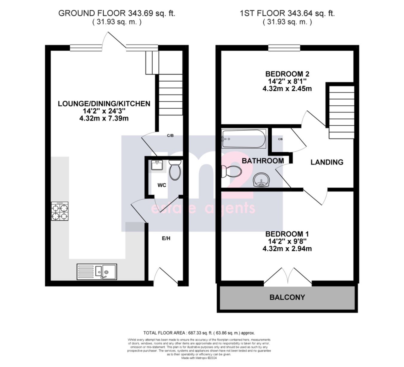 Upstairs the landing leads to two double bedrooms and a contemporary bath/shower room. The main bedroom features French doors opening onto a balcony.