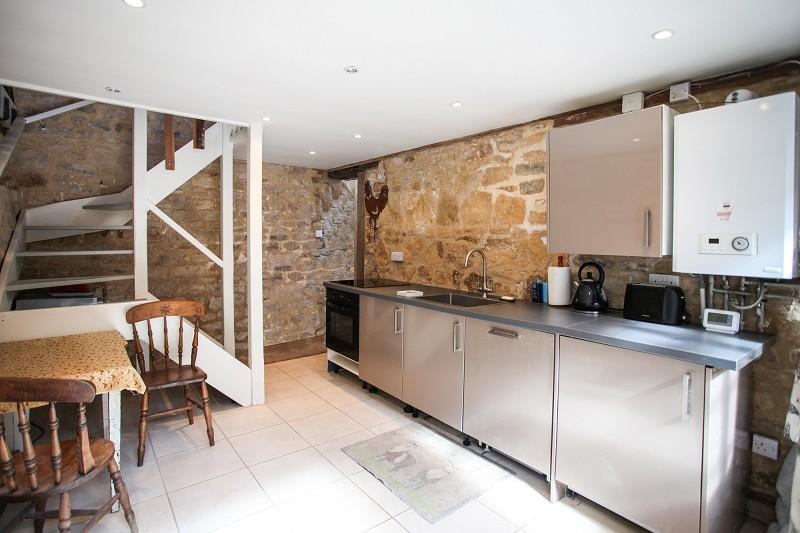 With ceramic tiled floor, random pointed Cotswold stone walls to three sides. Open tread staircase returning to first floor. Granite-style work tops, stainless steel sink unit with central mixer tap. Induction hob with electric circatherm oven below. Two base cupboards. Integrated Bosch dishwasher and integrated washing machine. One wall-mounted cupboard. Double radiator. Capriz 24C combination boiler for instantaneous hot water and gas fired central heating.