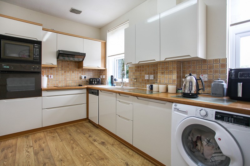 Southerly aspect with outlook over gardens and courtyard. Solid oak floor. Units fitted on two sides with wood grain effect laminate work surfaces with inset 1 1/2 asterite sink unit with single drainer and mixer tap, integrated Neff dishwasher, split level Neff microwave with built in electric circa therm oven below and split level fridge and freezer to one side. 7 separate base units and four matching wall mounted cupboards. Space and plumbing for automatic washer, built-in extractor.