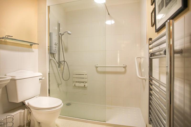 Full-width walk-in shower cubicle with built-in seat, fully tiled interior and Mira Advanced thermostatic electric shower unit. Low flush w.c., pedestal wash hand basin. Built-in extractor, shaver point and mirrored vanity cupboard. Ladder-style heated towel rail and radiator.