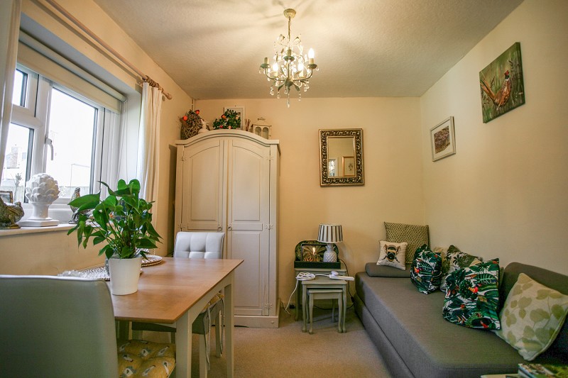 Double aspect windows to the front and rear of the property, two radiators. Wooden wall-mounted mantel piece with stone tiled hearth. Opening leading to dining area/bedroom two. Door leading to storage cupboard.