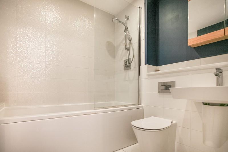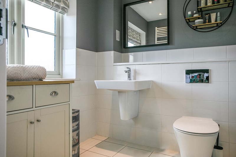 Three piece suite in white. Sink with chrome mixer tap over. Hand-held thermostatic shower. Vanity cupboard. Tiled on four walls. Extractor fan. Heated towel rail.