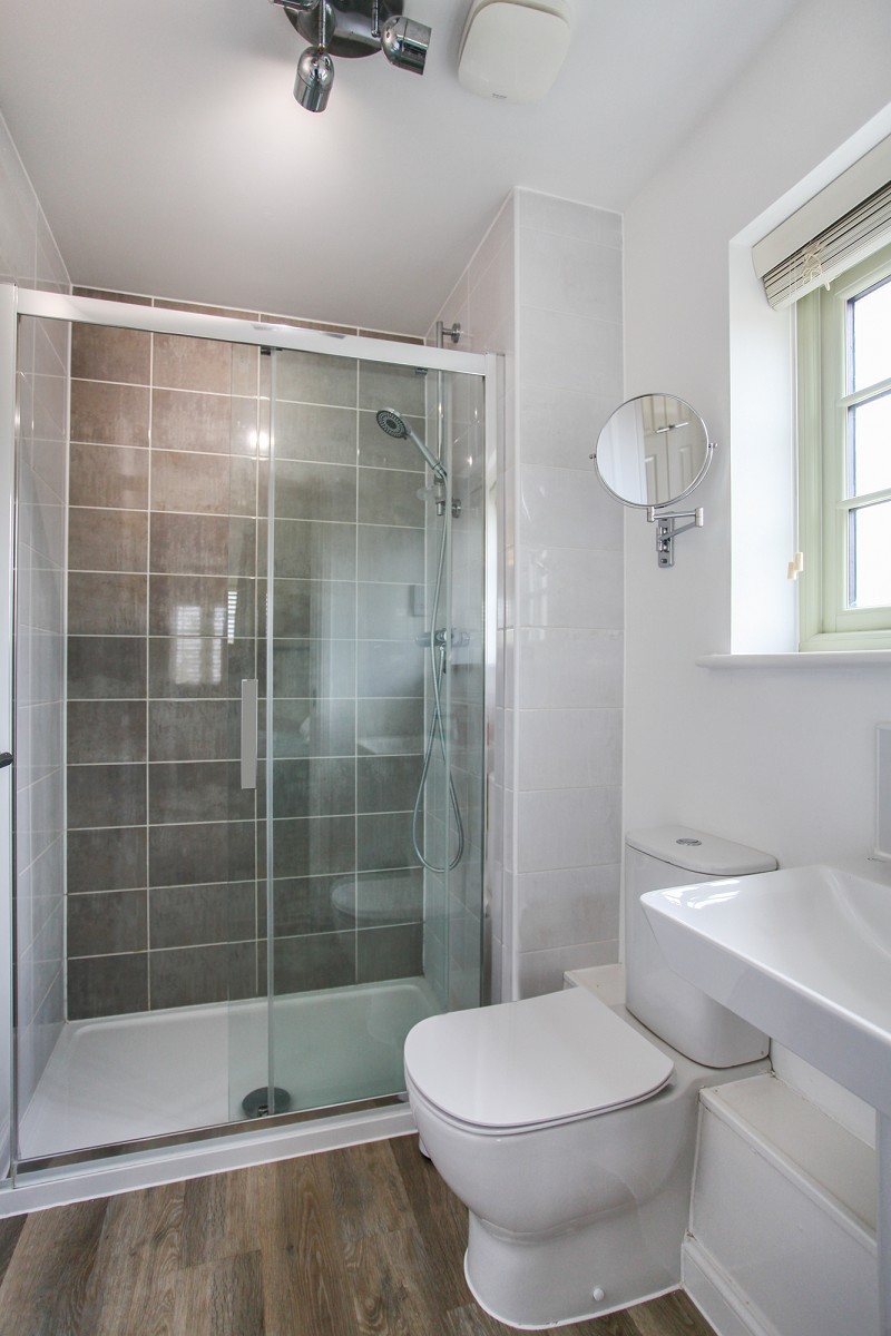 Glazed window. Two piece suite in white, sink with chrome mixer tap and tiled splashback. Walk-in double shower with mixer tap and thermostatic mixer tap over. Two fully tiled walls. Shaving point. Wall-mounted vanity mirror. Wall heated towel rail. Built-in extractor fan.