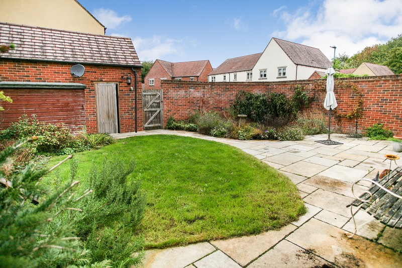 With patio and lawned area. Mature shrub beds. Timber cabin. Access to garage. Side access to driveway. Half-walled garden and timber fencing. Two outside lights. Water butts. Outside tap. Fixed washing line.