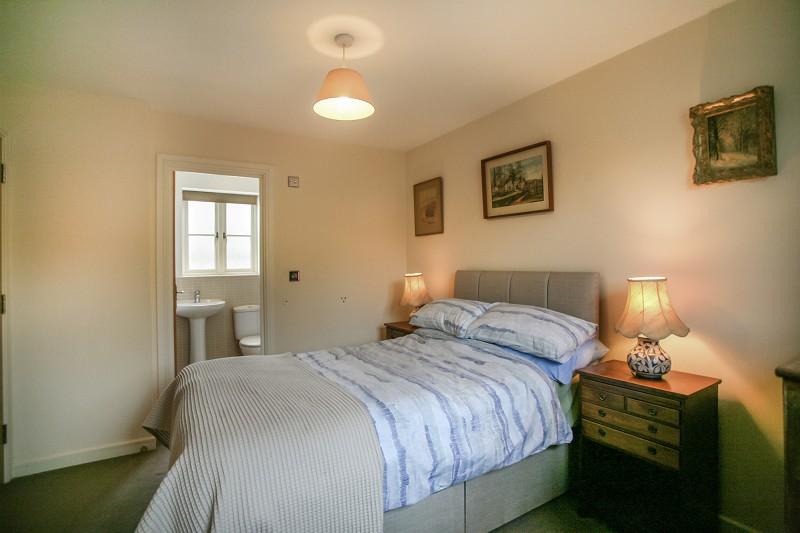 Window with privacy glass overlooking rear garden. Tiled on one wall. Two piece suite in white, sink with mixer tap. Double shower with thermostatic rain shower head and hand-held shower spray. Grab rail. Wall-mounted vanity mirror, shaving point. Wall-mounted heated towel rail and chrome towel holder. Tiled flooring. Extractor fan and spotlights.