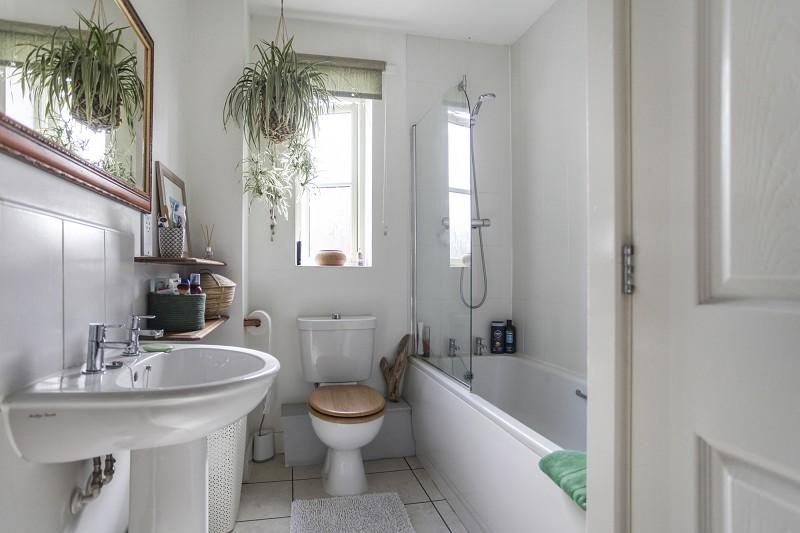 With three piece suite in white, pedestal wash hand basin, low flush w.c., handled panel bath with glazed shower screen and thermostatic Mira shower. Vinyl flooring in tiled-style, single radiator. Built-in shaver point with two shelves below and built-in airing cupboard with Potterton Pro-Max combination boiler for instantaneous hot water and gas fired central heating.