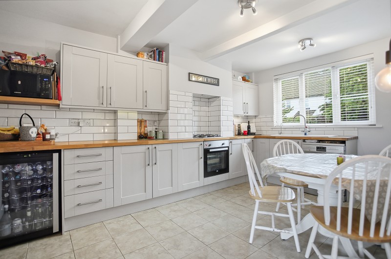 Ceramic tiled floor. Double radiator. Light oak-style parquet worktops fitted to two sides with inset 1 1/2 ceramic sink unit with single drainer and swan neck mixer tap and integrated hot water tank below suitable for boiling water. Integrated water filter. Four ring Beko gas hob with built-in electric circatherm oven below set in to original fireplace. Seven base cupboards. Five matching wall-mounted cupboards. Double patio doors opening on to rear garden. Easy staircase leading to first floor.