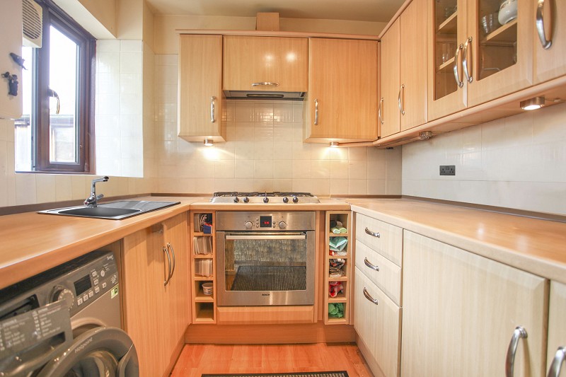 With oak-style laminate flooring. Kitchen fitted on three sides with laminate work tops, split-level five ring gas hob with built-in electric circatherm oven below. Wall-mounted Worcester combination boiler for instantaneous hot water and gas fired central heating. Space and plumbing for automatic washer, five base cupboards, eight matching wall-mounted cupboards with pull-out cooker hood and ten bottle wine rack. Tiled surround to work surfaces, built-in extractor and double doors opening to rear conservatory.