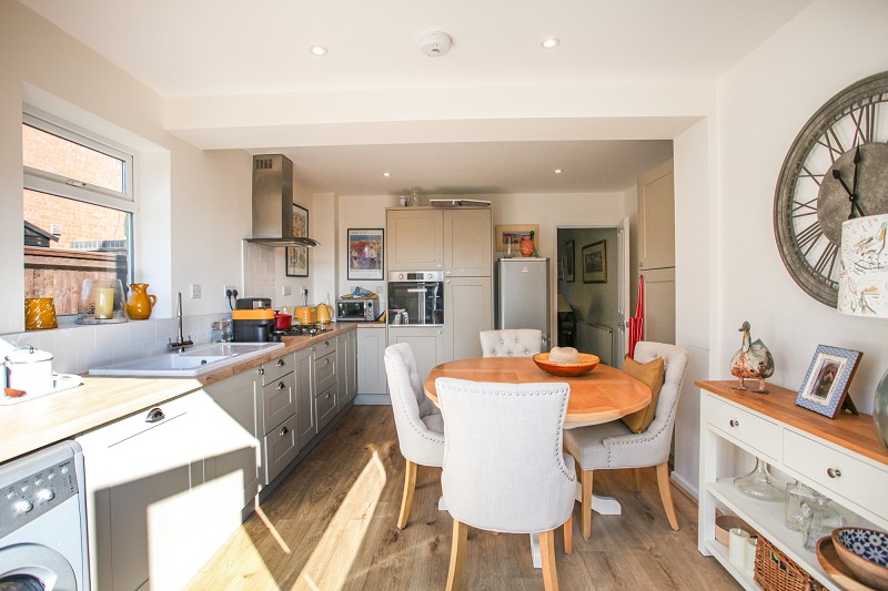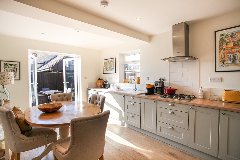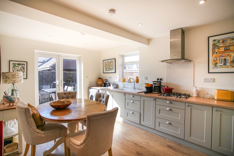 Timber laminate flooring. Double French doors leading on to westerly-facing rear garden and separate side window also with outlook over garden. Beech-style laminate work tops fitted to two sides with inset enamel sink unit with single drainer and swan necked mixer tap. Seven base cupboards, two tier larder cupboard. Integrated Hotpoint dishwasher and space and plumbing for automatic washer. Part-tiled surround to work surfaces. Split-level electric oven with cupboard above. Four ring stainless steel Hotpoint gas hob and externally ducted cooker hood above. Separate two-tier cupboard housing Worcester combination boiler for instantaneous hot water and gas fired central heating. Eight inset spotlights to the ceiling. Double radiator.
