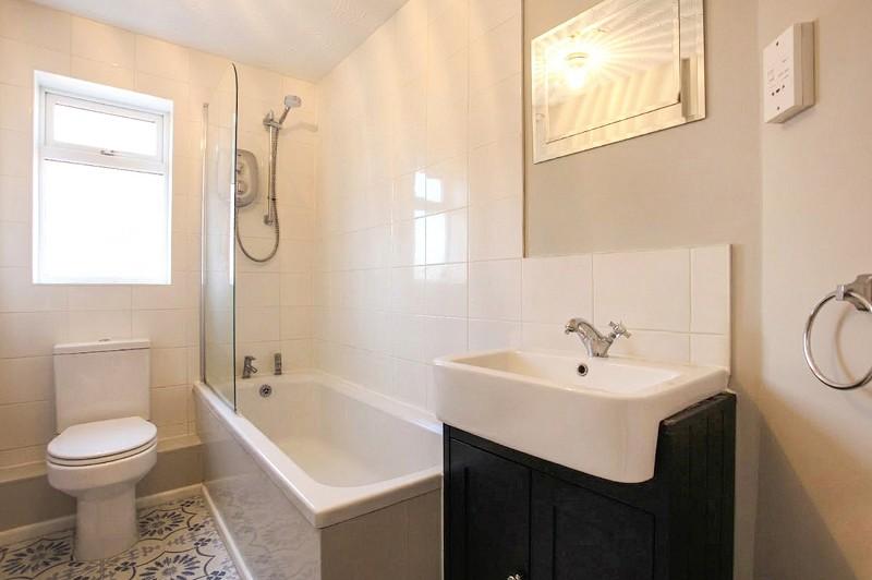 Three piece suite in white, low flush w.c., panelled bath with Mira electric shower, glazed screen and fully tiled surround. Wash hand basin set on to double cupboard with dressing mirror above. Shaver point. Built-in extractor. Single radiator and chrome towel rail.