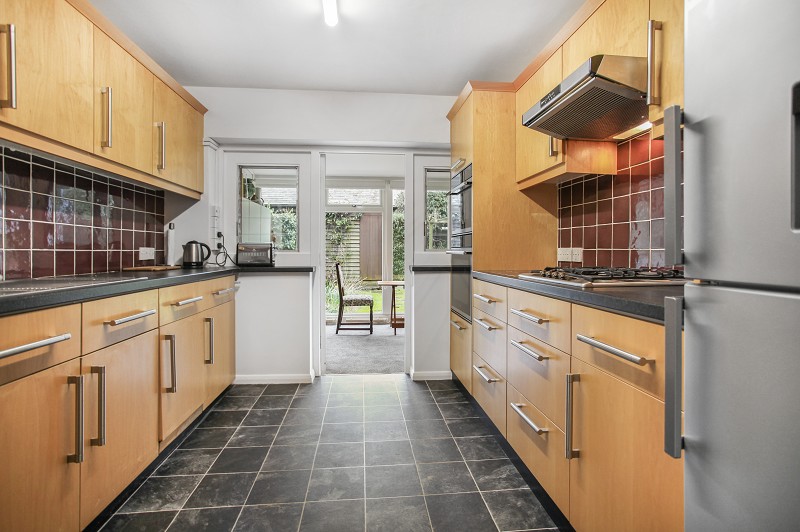Upvc double glazed to two sides with particularly attractive outlook over enclosed south facing rear garden. Utility area with work top, two base cupboards and four wall mounted cupboards. Hotpoint washing machine and Bosch tumble dryer. Built in extractor. Two strip lights. Door to rear garden. Seven low level circular radiators.