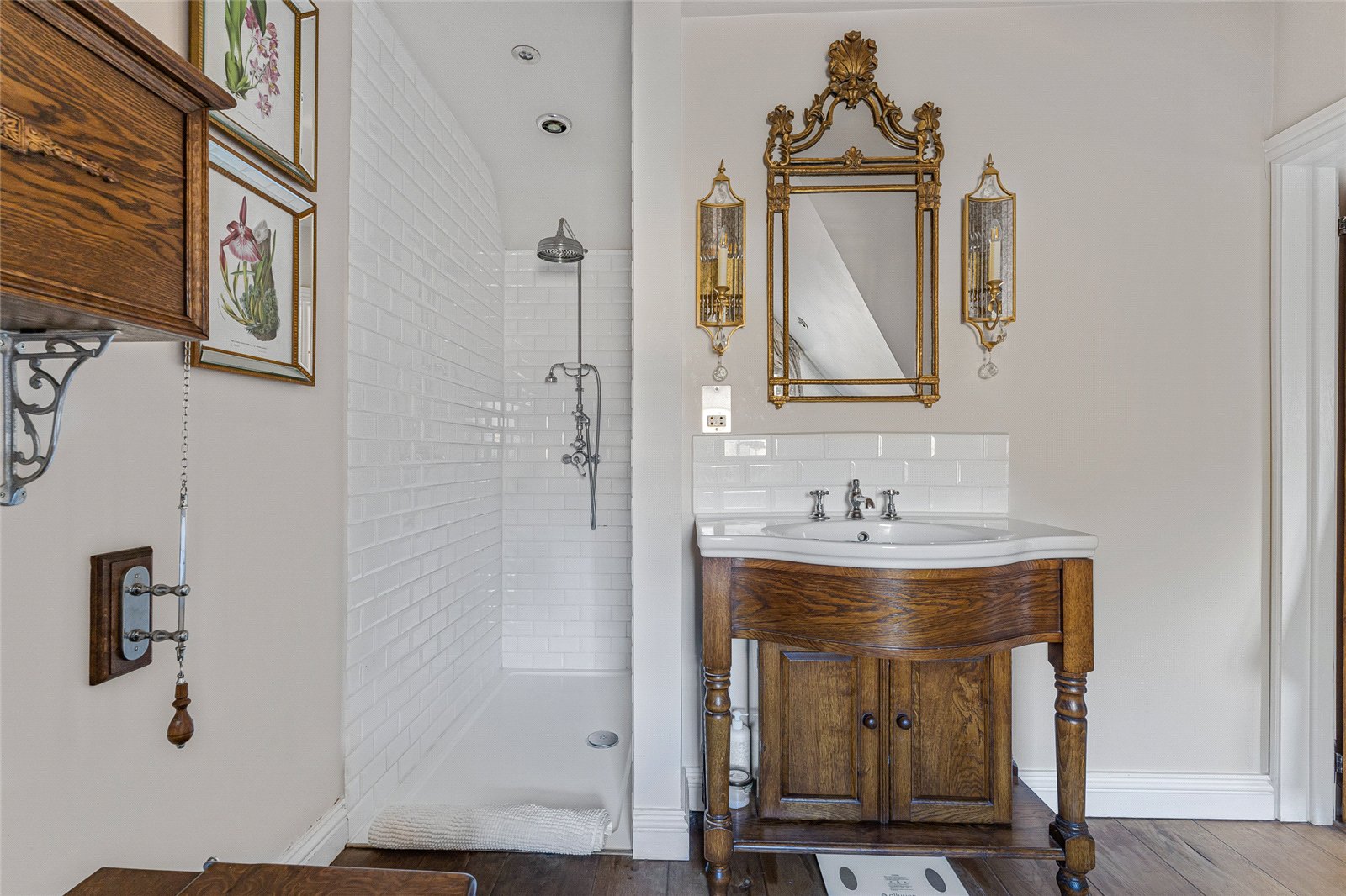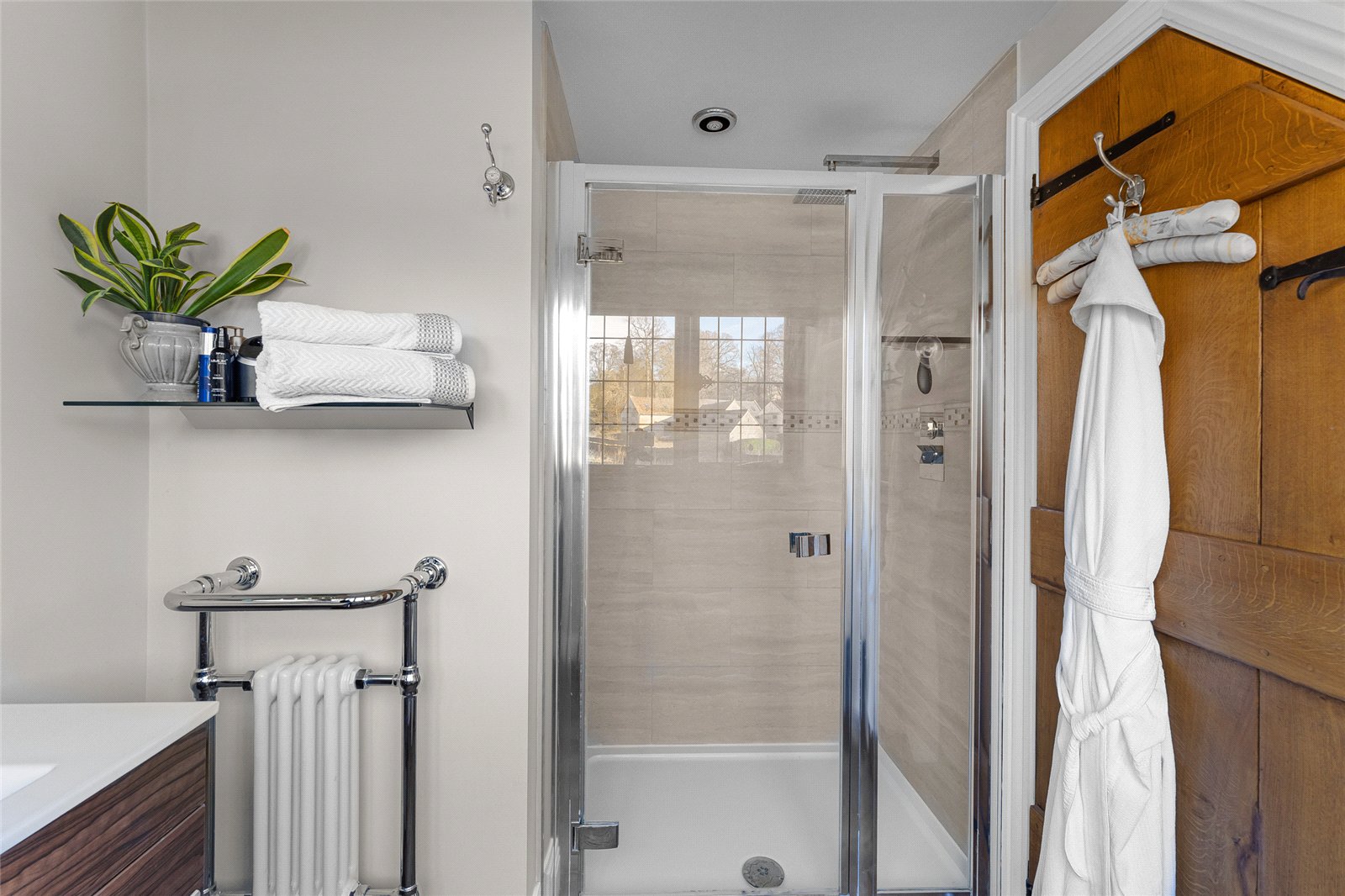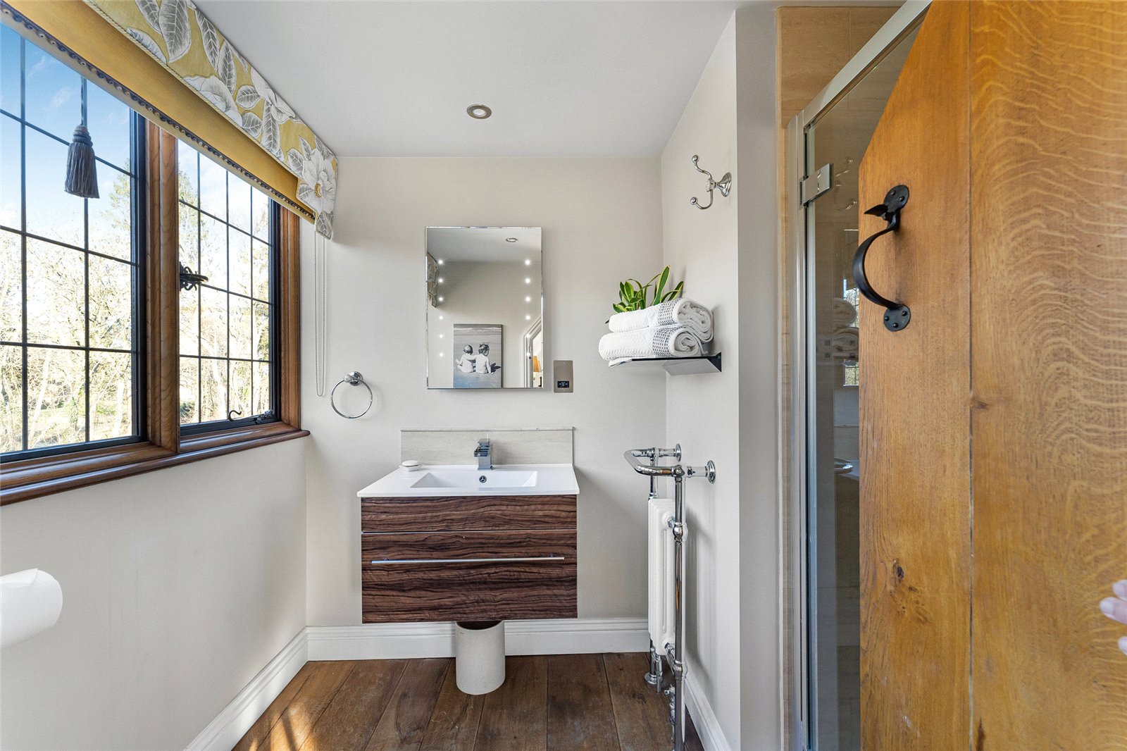 En-suite Shower Room: Double glazed window to rear aspect, oak floorboards, hand wash basin, wall mounted vanity unit, heated towel rail, walk-in shower.