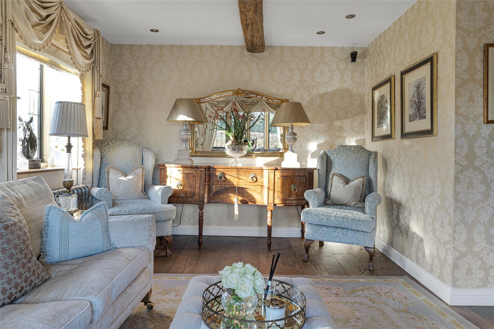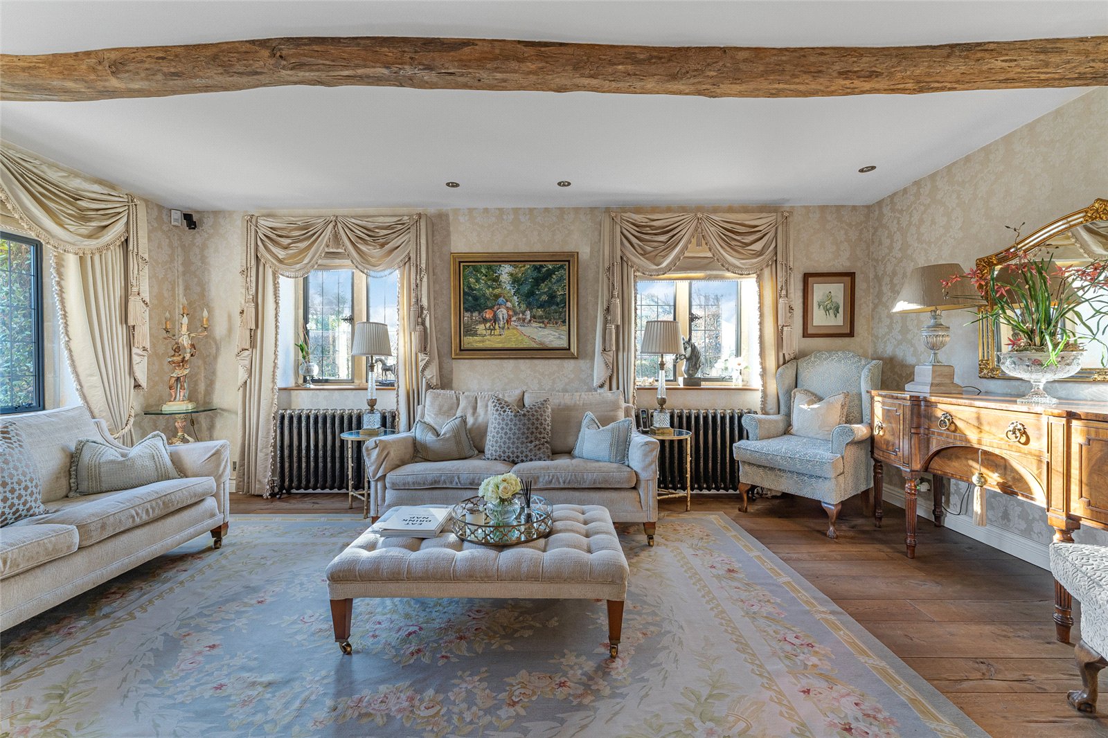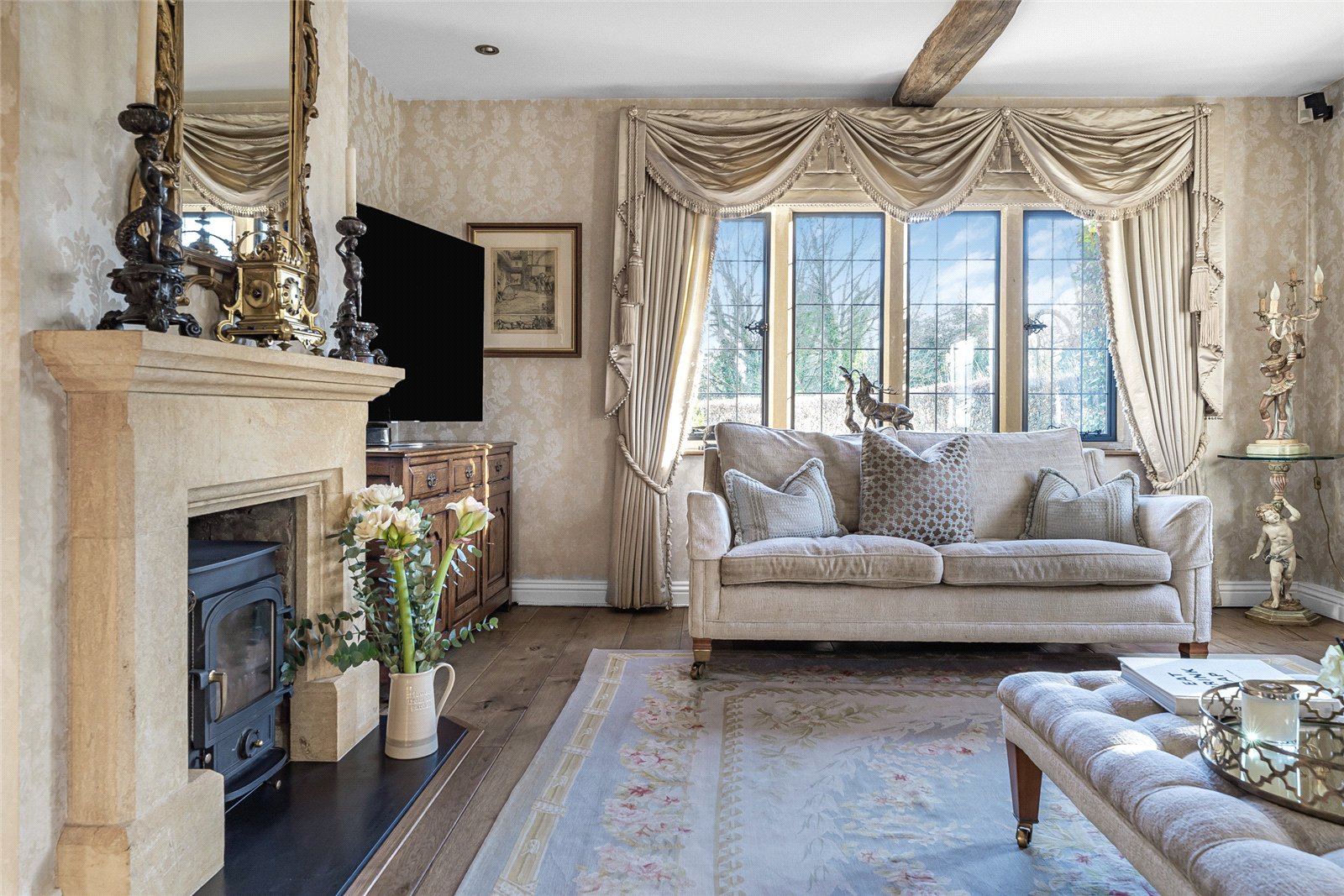 Sitting Room: Engineered oak flooring, dual aspect stone mullion windows, feature wood burner with stone surround and marble hearth exposed beam.