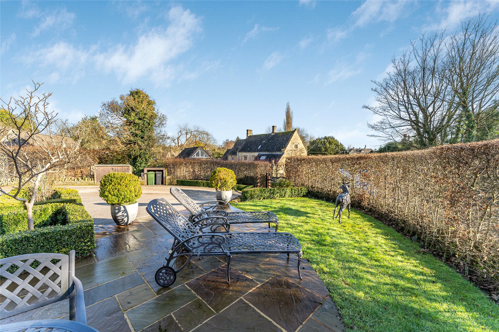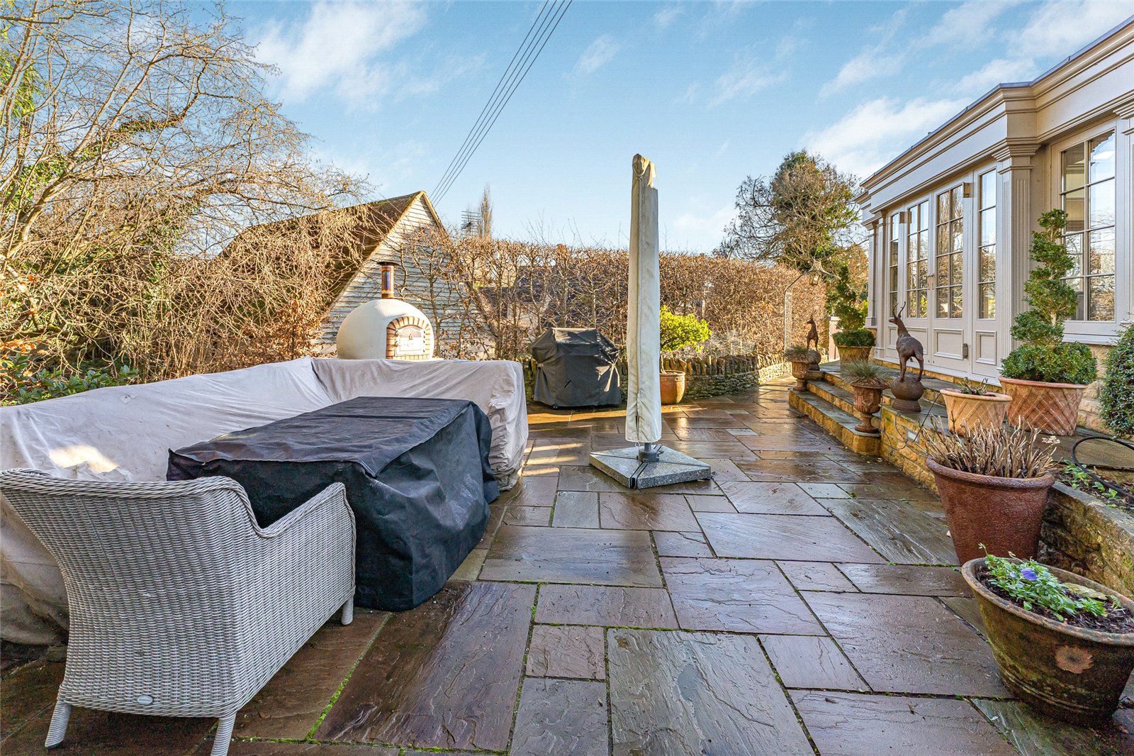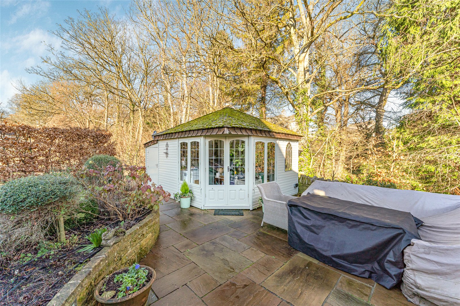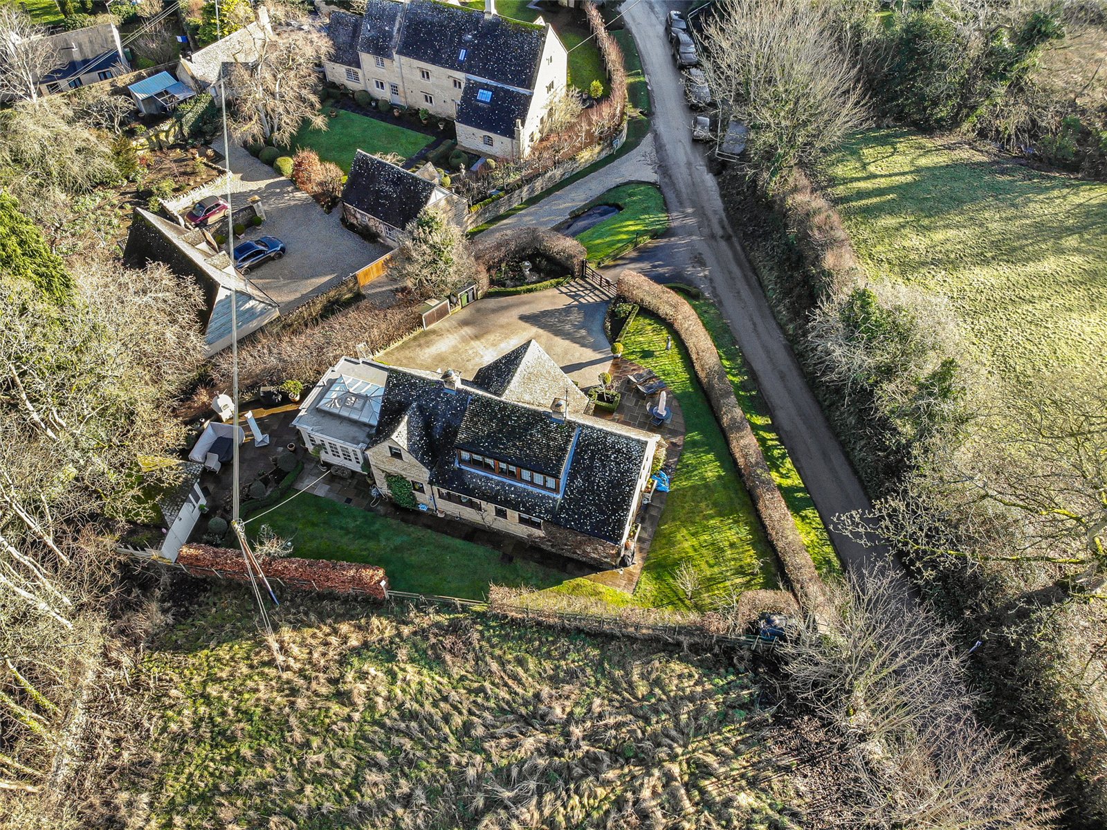 Brookside sits in an elevated position within the village, set behind a five bar gate and stone wall, there is ample of driveway parking with landscaped gardens to the side and rear of the property. There is a stone paved terrace adjacent to the Orangery and Summer House.