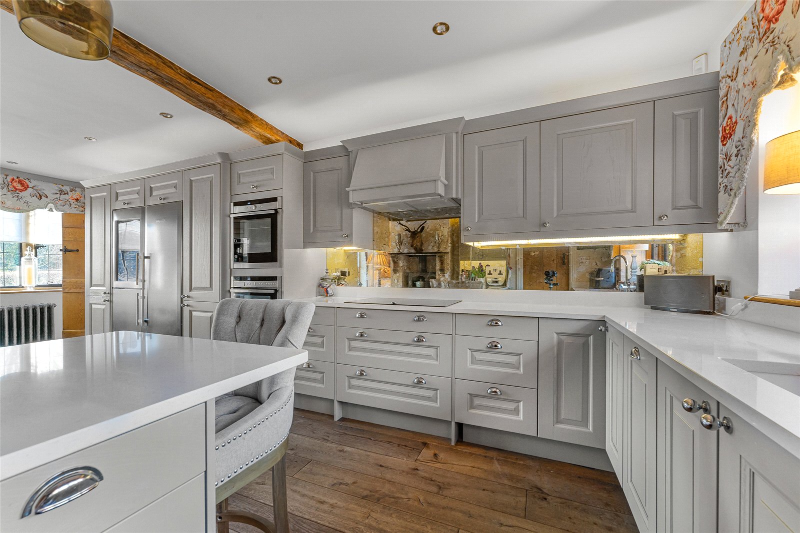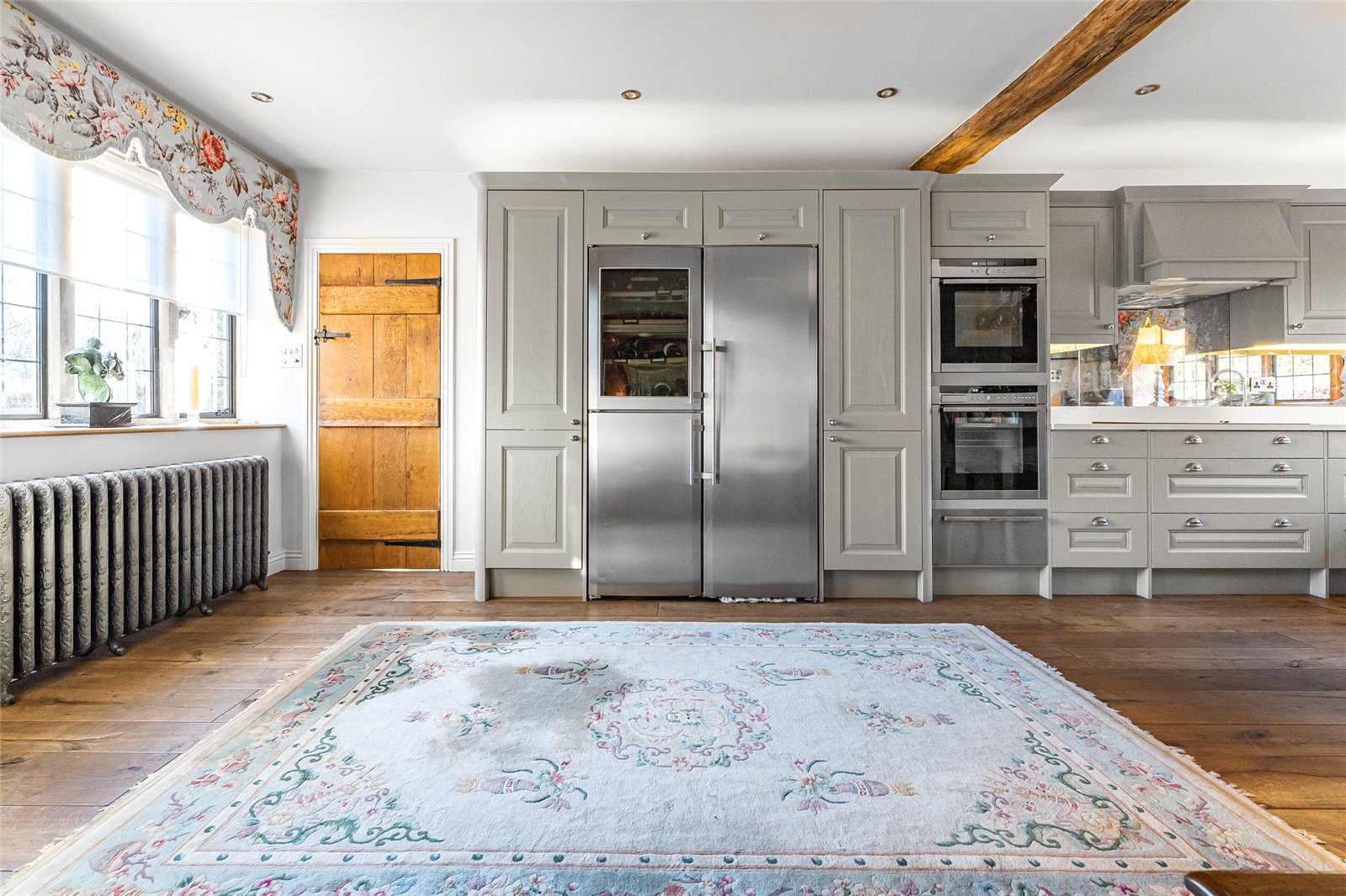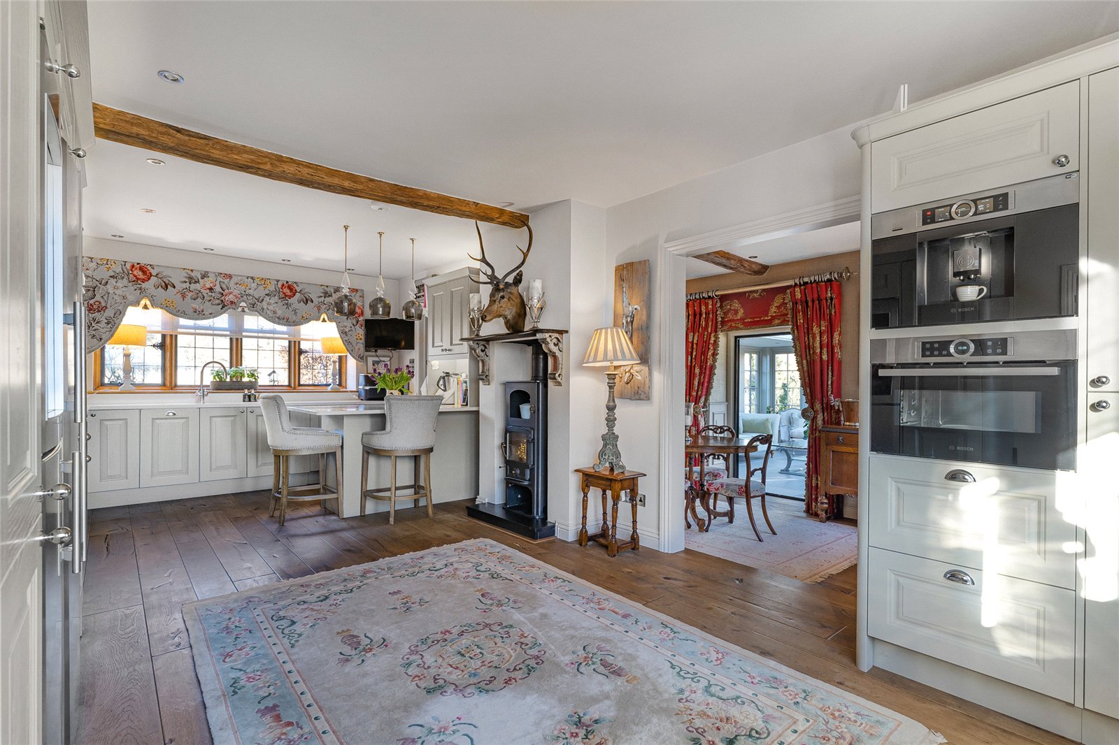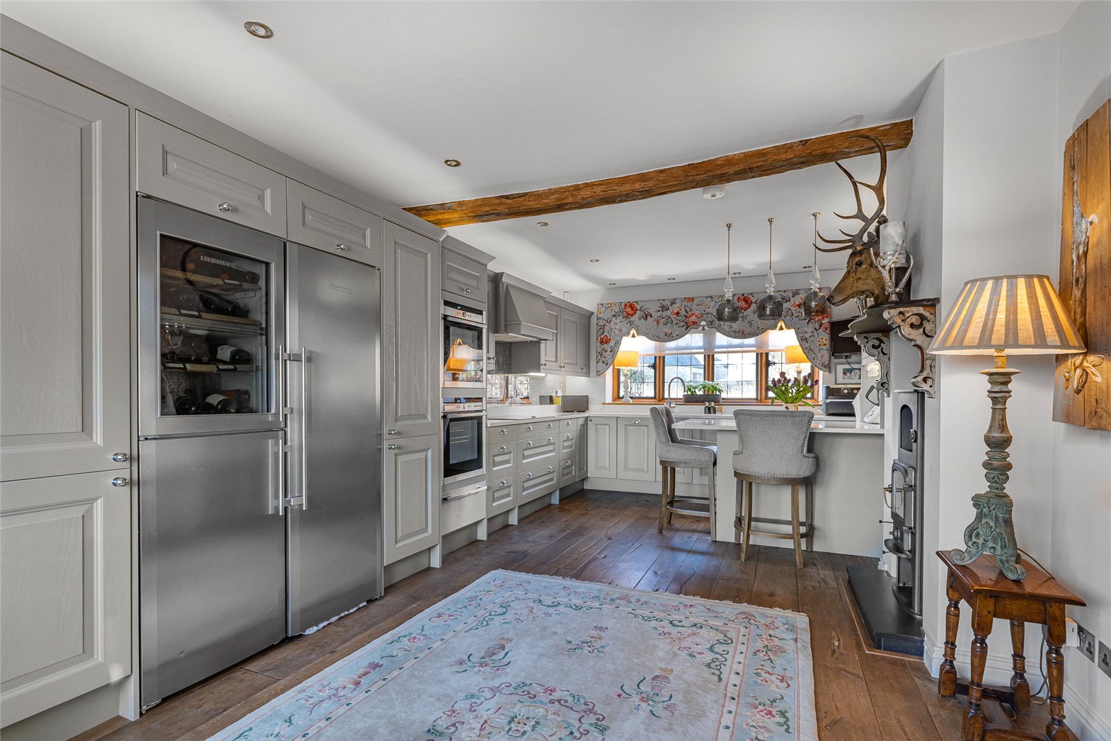 Kitchen: Stone mullion windows to front aspect, cast iron radiators, wine cooler, bespoke kitchen units with integral dishwasher, Liebherr fridge freezer, Bosch coffee maker, and microwave. Four ringed Melia hob, double Ness oven, extractor hood, instant hot tap and sparkling water, feature wood burner fire, ceiling spotlights, brace and latch door to