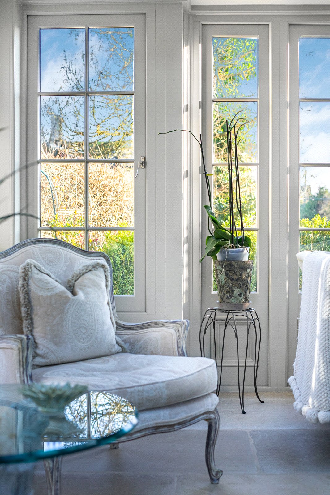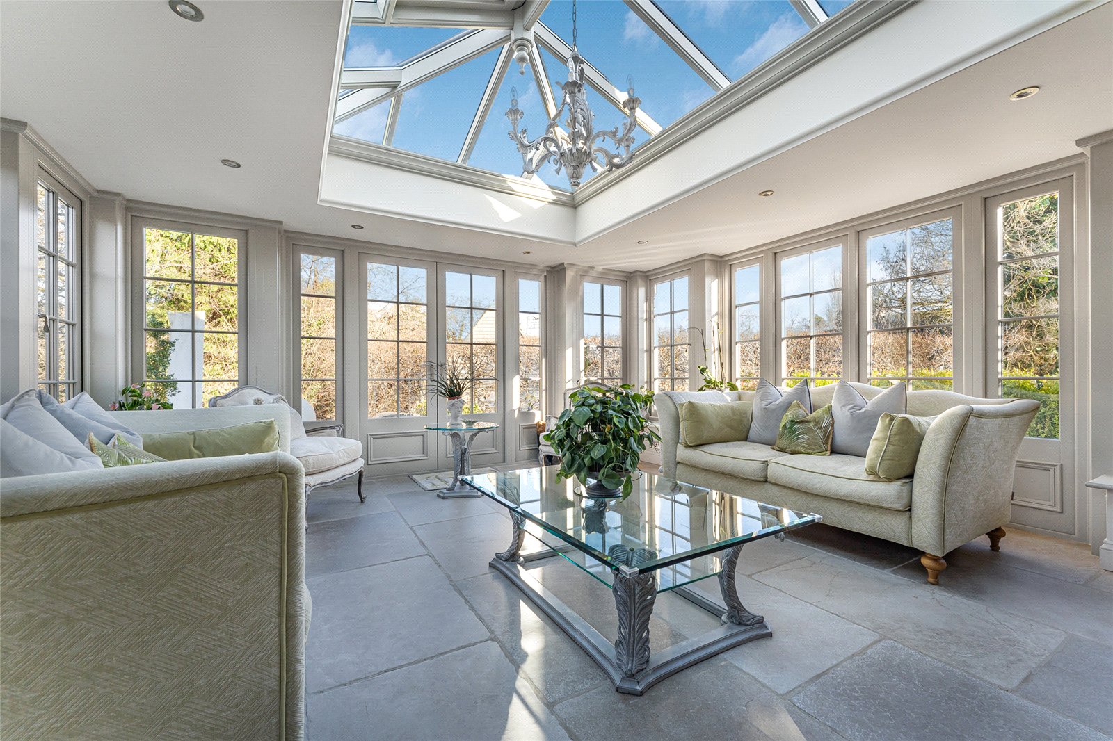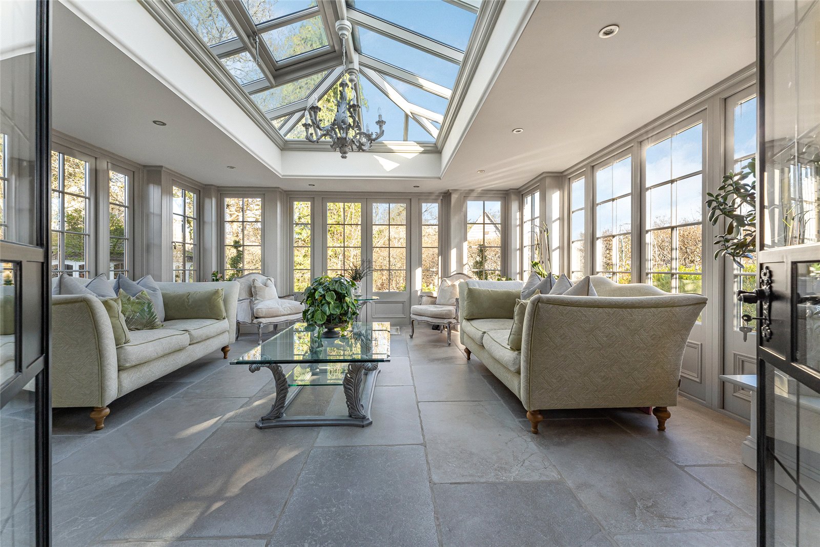 Orangery: Underfloor heating to flagstone floor. A wonderful reception room with ample light from all sides and a glass ceiling, fully double glazed bespoke windows and French door that opens out onto the rear stone paved terrace.
