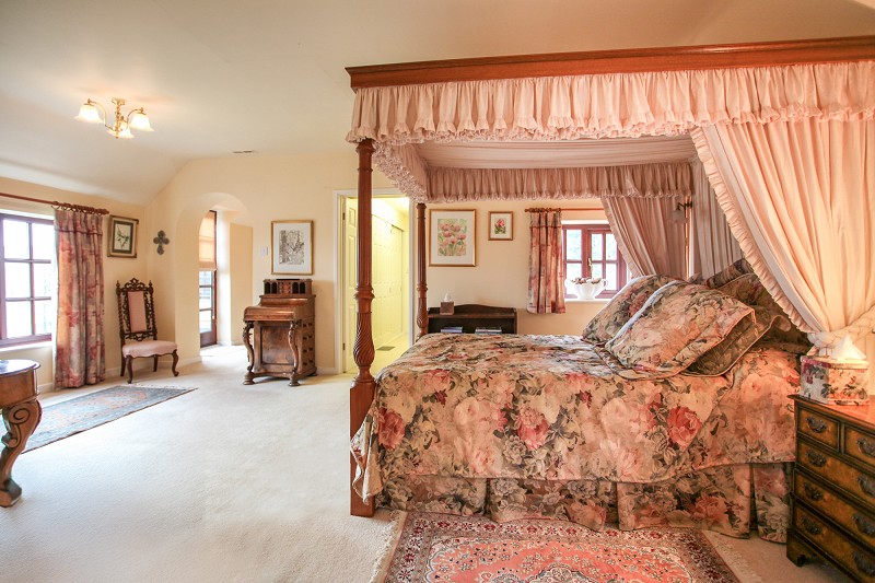 Quarter circle window with views over village. Curtained wardrobe area. Skylight window. Access to bedroom three.