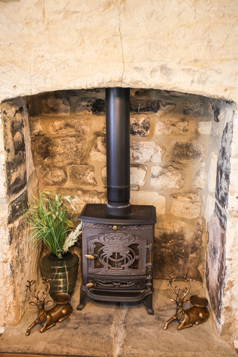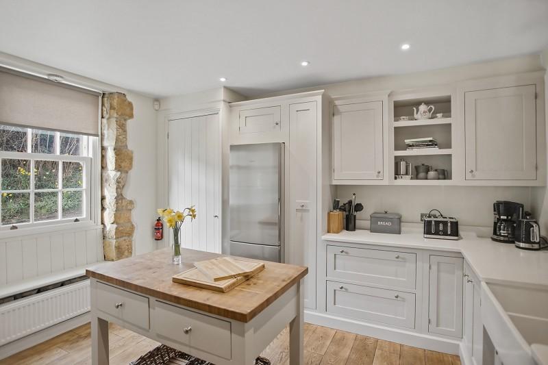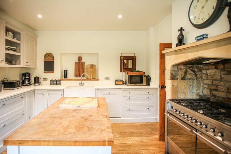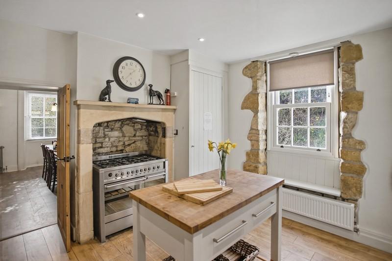 Fitted on two sides with quartz work tops, double inset butlers sink. Two and three tier pan drawer. Integrated dishwasher. Four further cupboards. Large pantry cupboard. Open book shelf and three wall-mounted cupboards. Built-in window seat with westerly aspect, stone trim and radiator below. Cotswold stone fireplace, currently housing stainless steel Range with six gas burners and two built-in ovens. Built-in airing cupboard with combination boiler for instantaneous hot water and gas fired central heating. Separate full-height pantry cupboard and space for fridge freezer.
