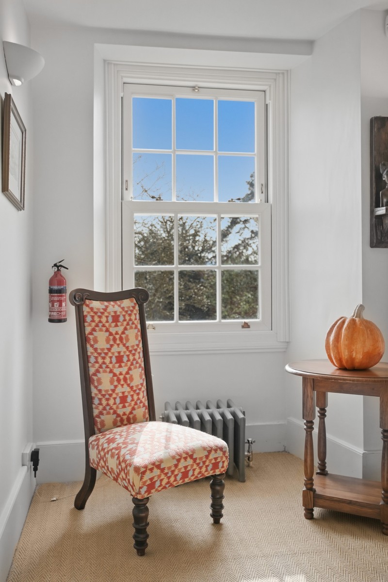 Low level column radiator. Southerly-facing window with outlook over gardens.