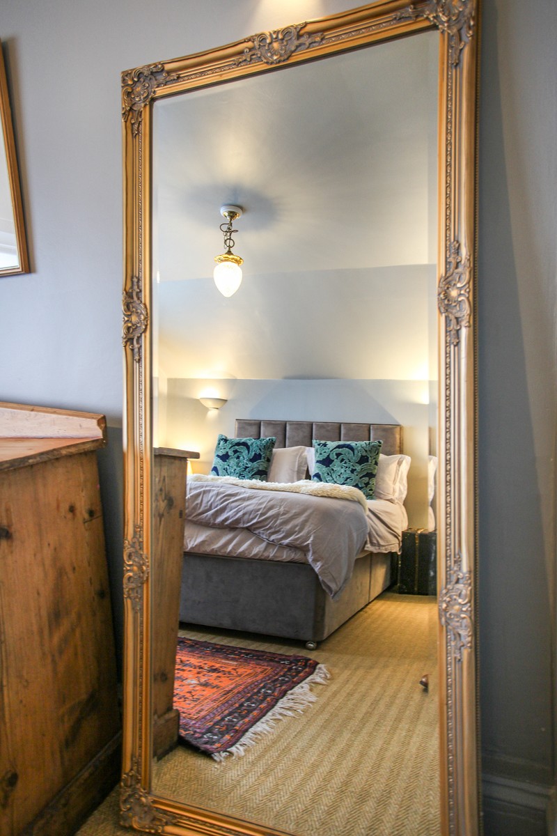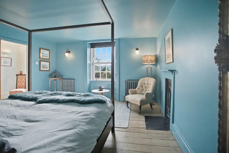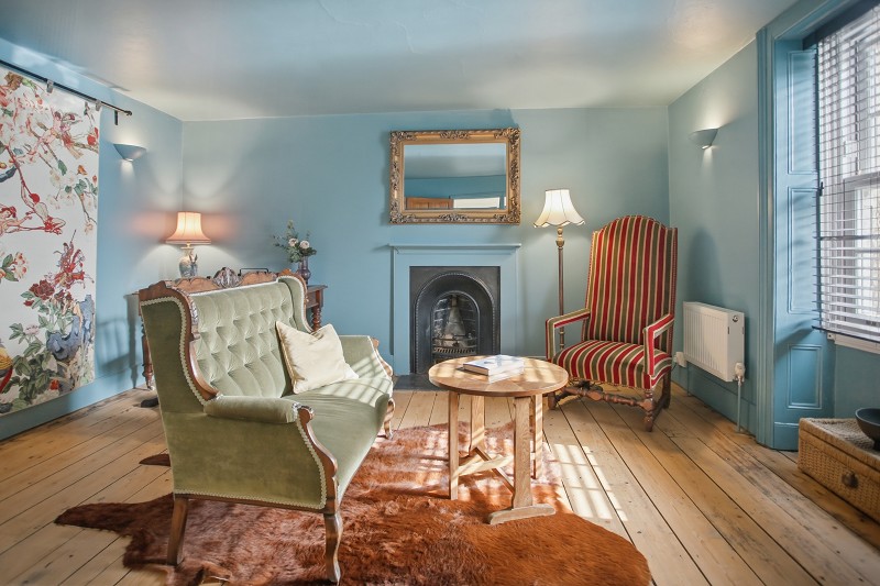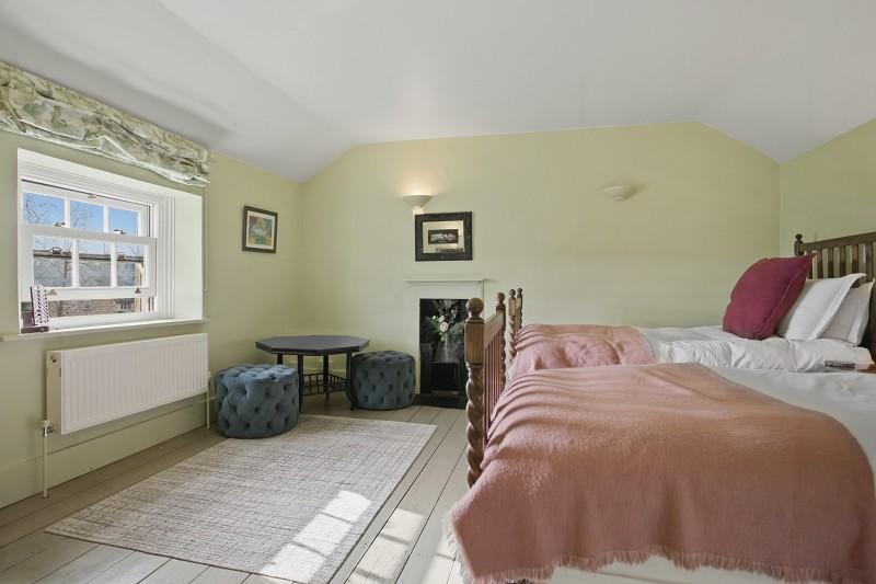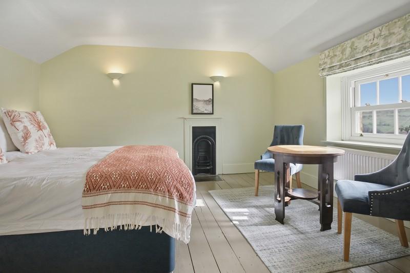 Exposed pine floorboards. Southerly aspected window with views towards countryside. Two double radiators. Cast iron Victorian fireplace with slate hearth and four wall-mounted light points.