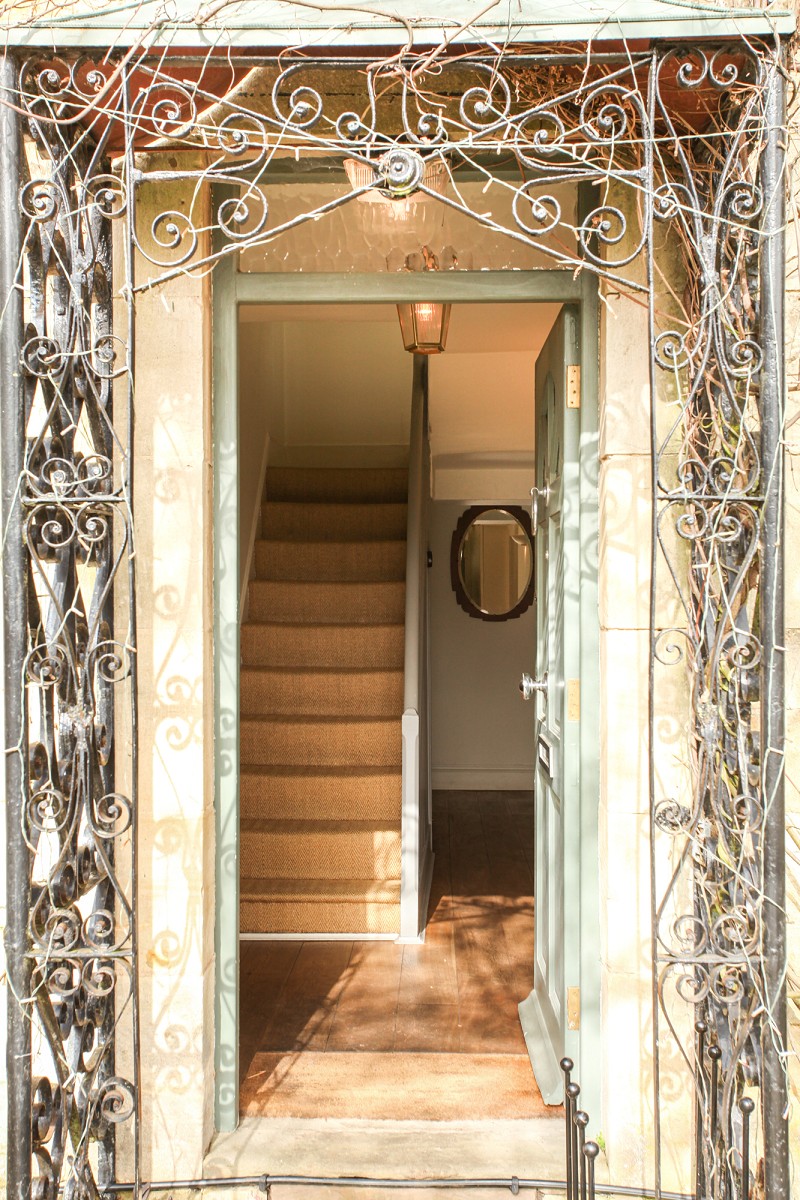 There is a Regency style wrought iron porch immediately adjacent to the front door.